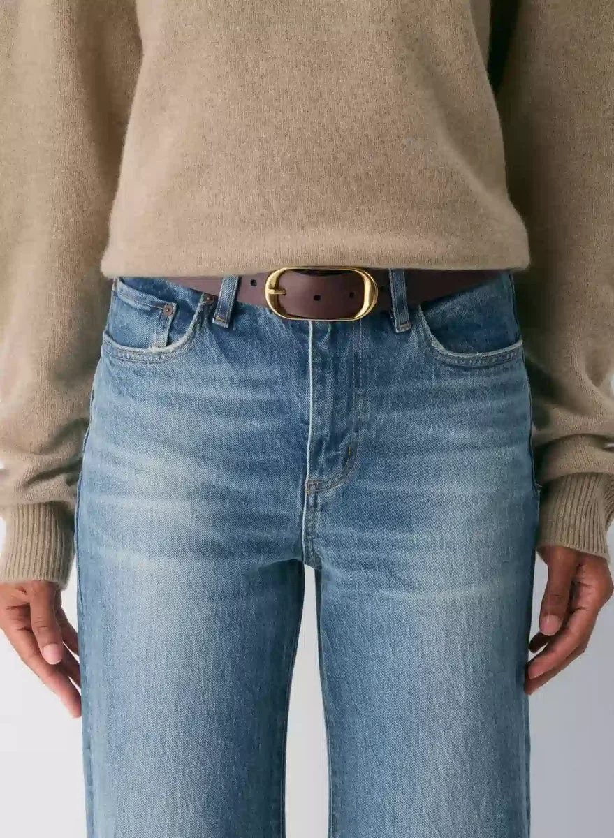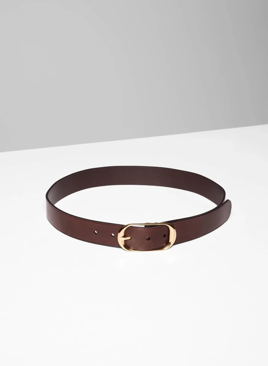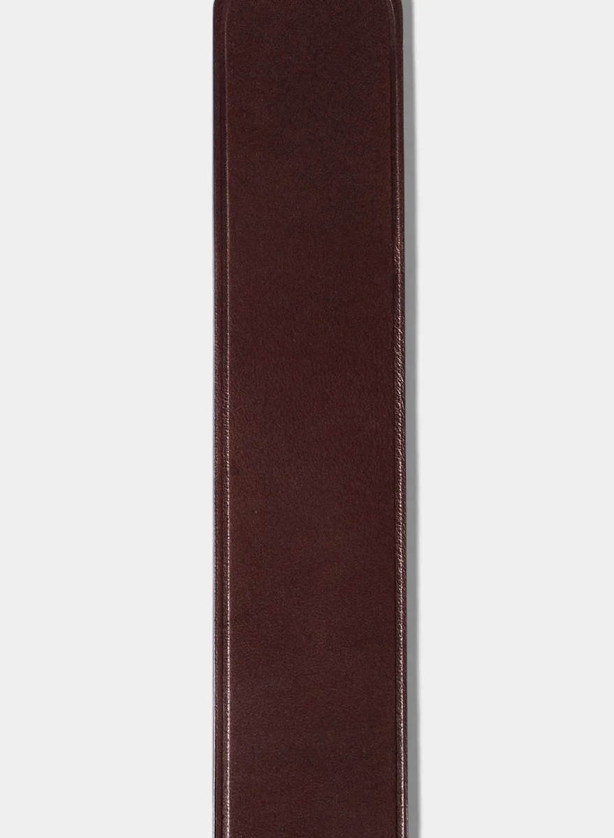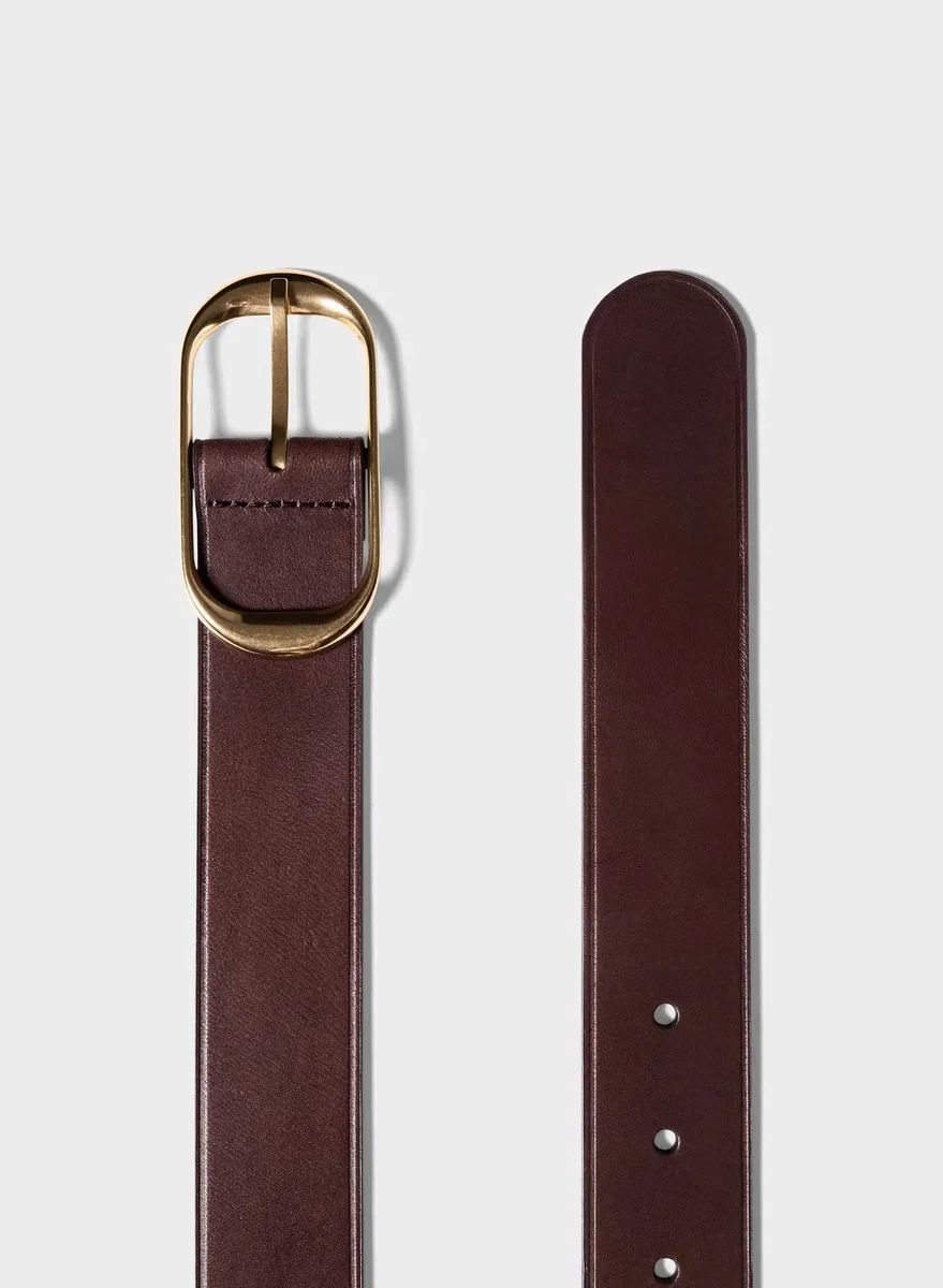 This is a wide belt with a solid brass oval buckle, hand-painted edges and a flat surface for a sleek look. It’s cut from Smooth Leather — 100% leather with a clean, smooth finish.