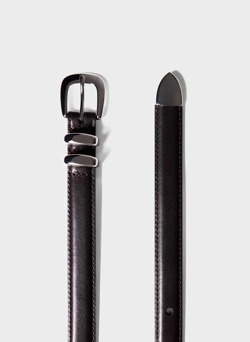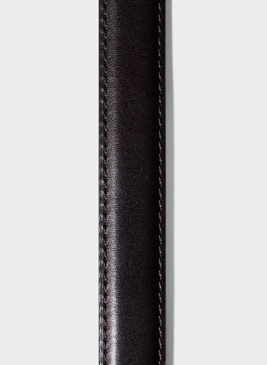 This is a slim western-inspired belt with hand-painted edges, a bombe surface for a rounded look and a solid brass buckle, keeper and tip end. It’s cut from Smooth Leather — 100% leather with a clean, smooth finish.