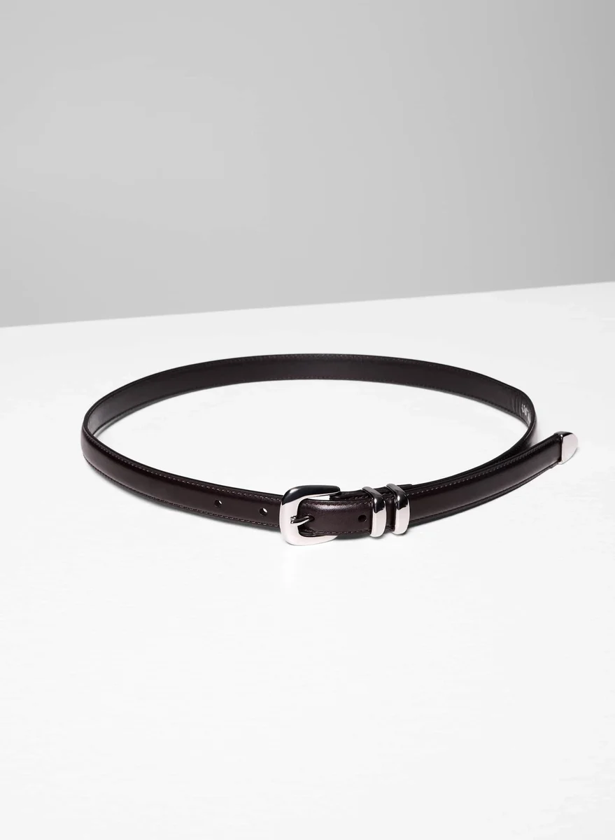 Teach your pants to “stay” This is a slim western-inspired belt with hand-painted edges, a bombe surface for a rounded look and a solid brass buckle, keeper