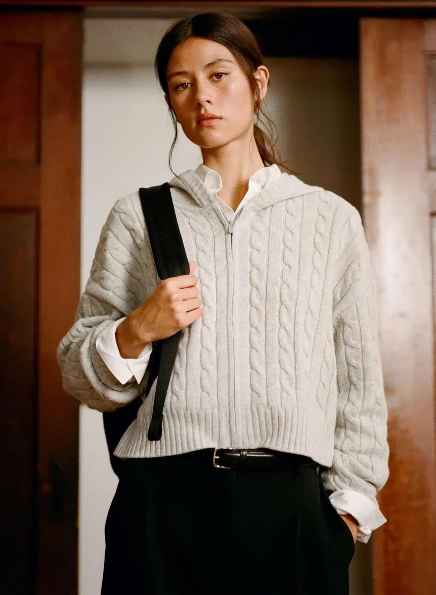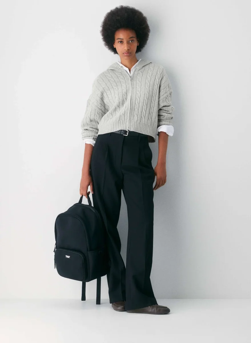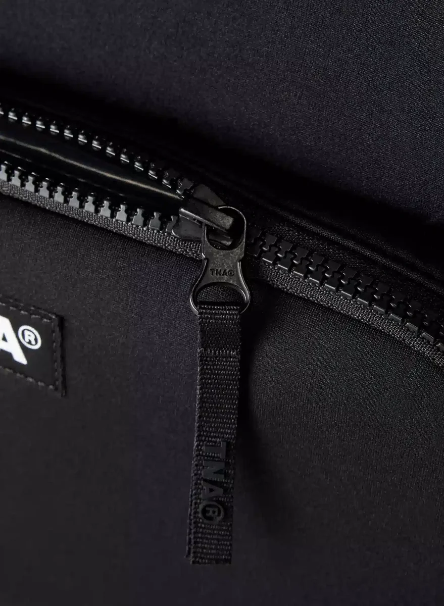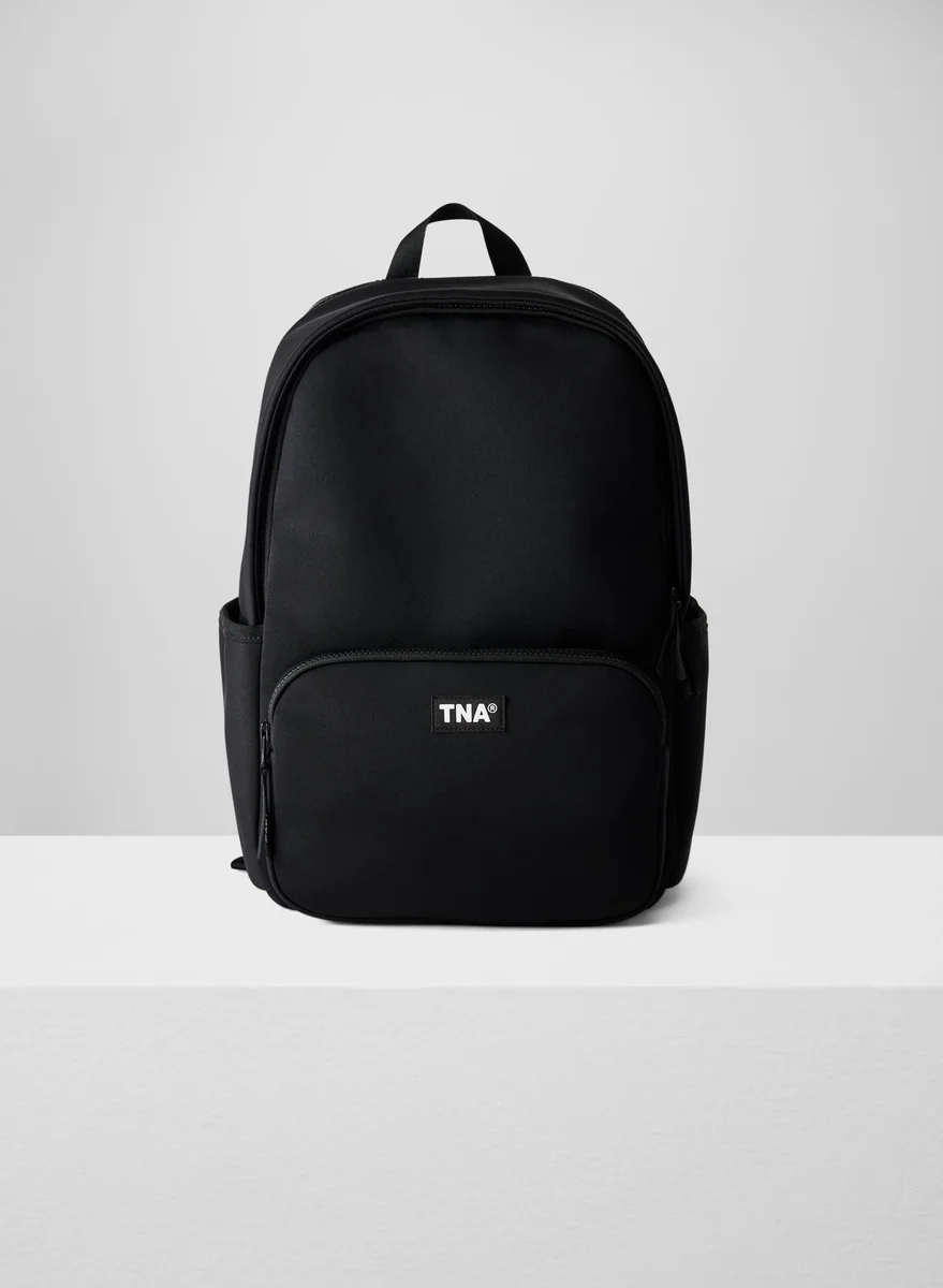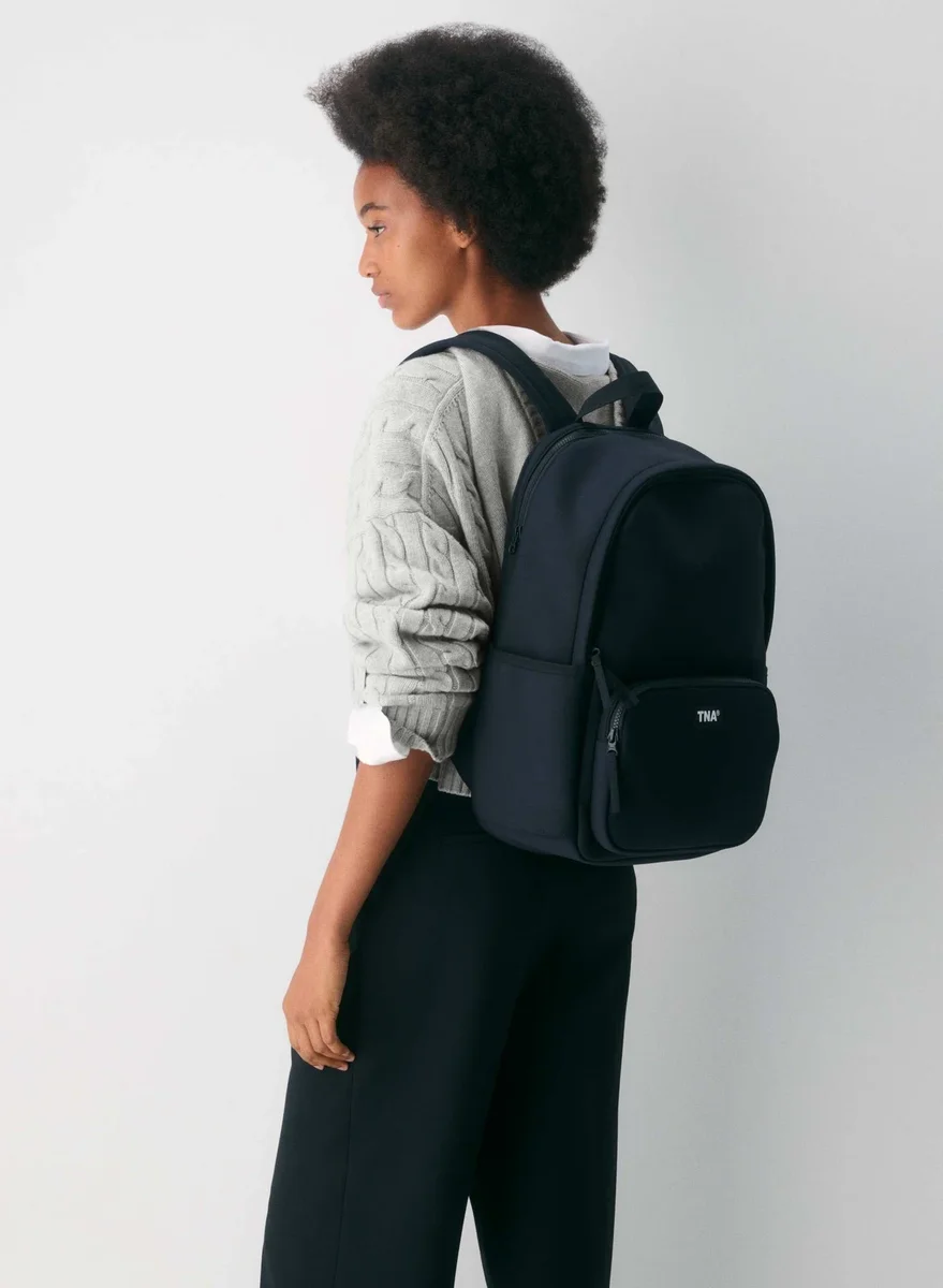 This is a backpack with adjustable shoulder straps and lots of pockets. It’s crafted with interlock jersey that’s double-knit for a smooth, softly structured feel.