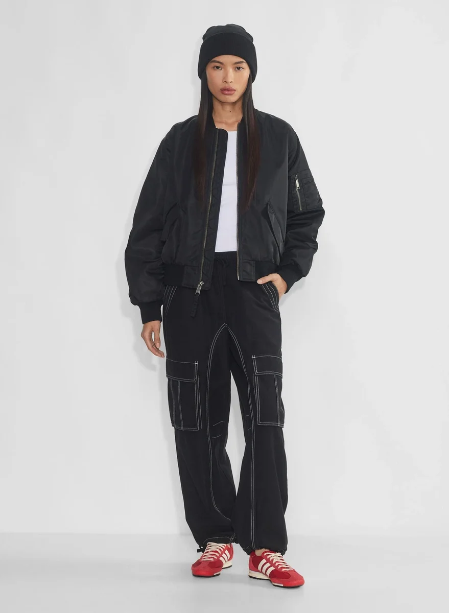 This is a cuffed knit beanie with a taller silhouette. It’s jersey-knit with soft, cozy yarn made from recycled materials.
