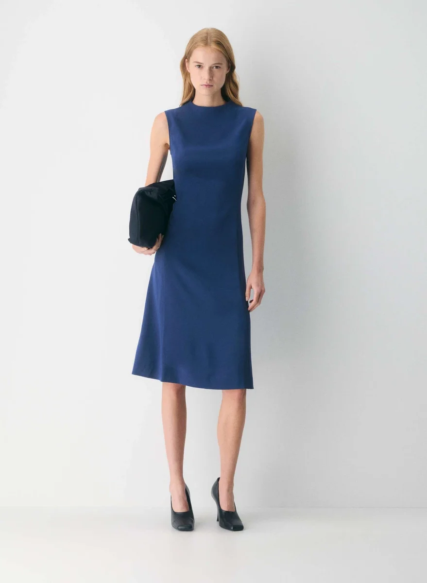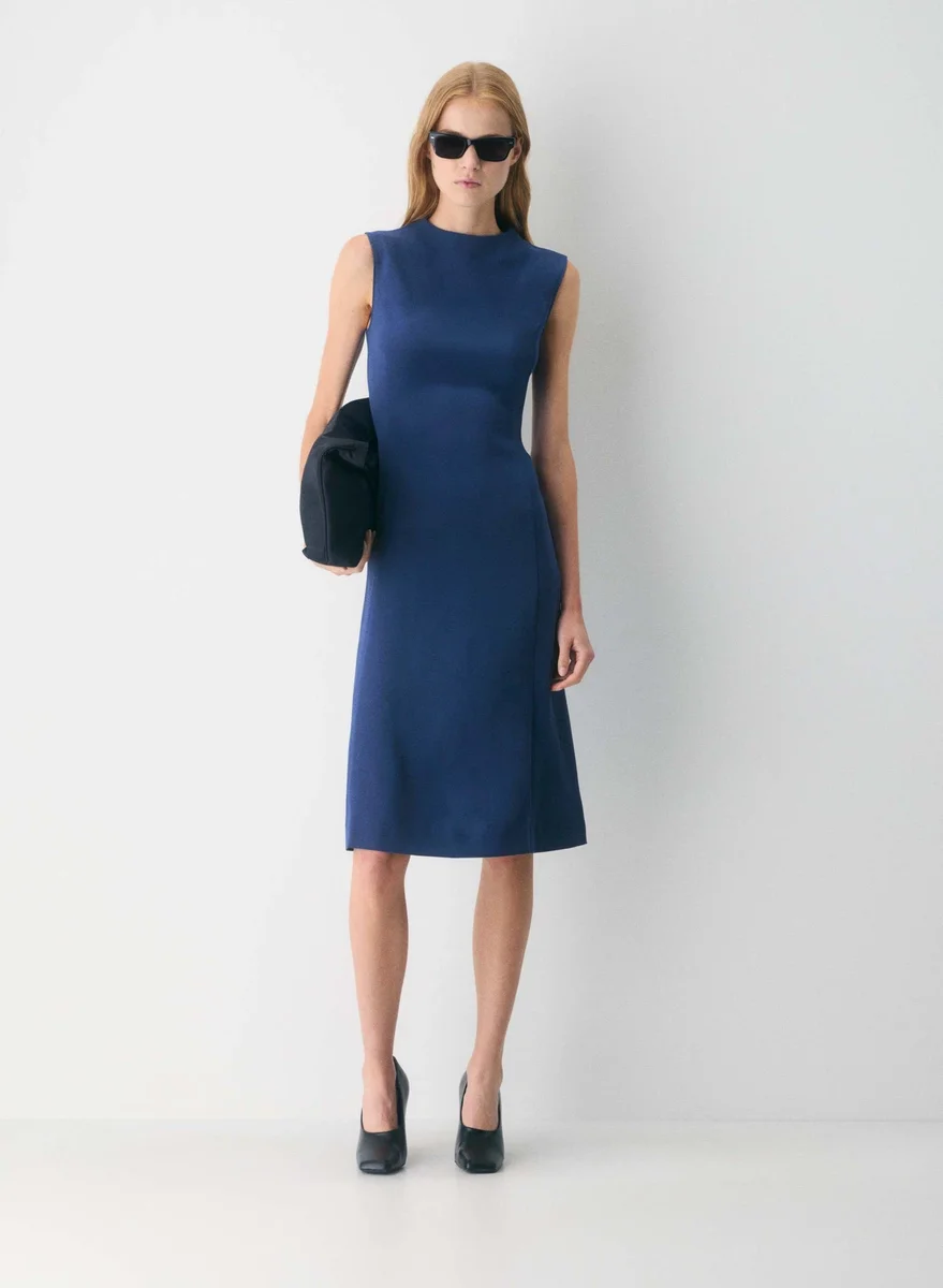 This is a sleeveless midi dress with a mock neckline and princess seams for shaping. It’s made with Mirror Crepe™ — essential crepe fabric with a soft drape and silky satin back. It’s sourced from an innovative Japanese mill and made with 82% triacetate, wood-based fibres from responsibly managed forests with a focus on protecting ecosystems.
