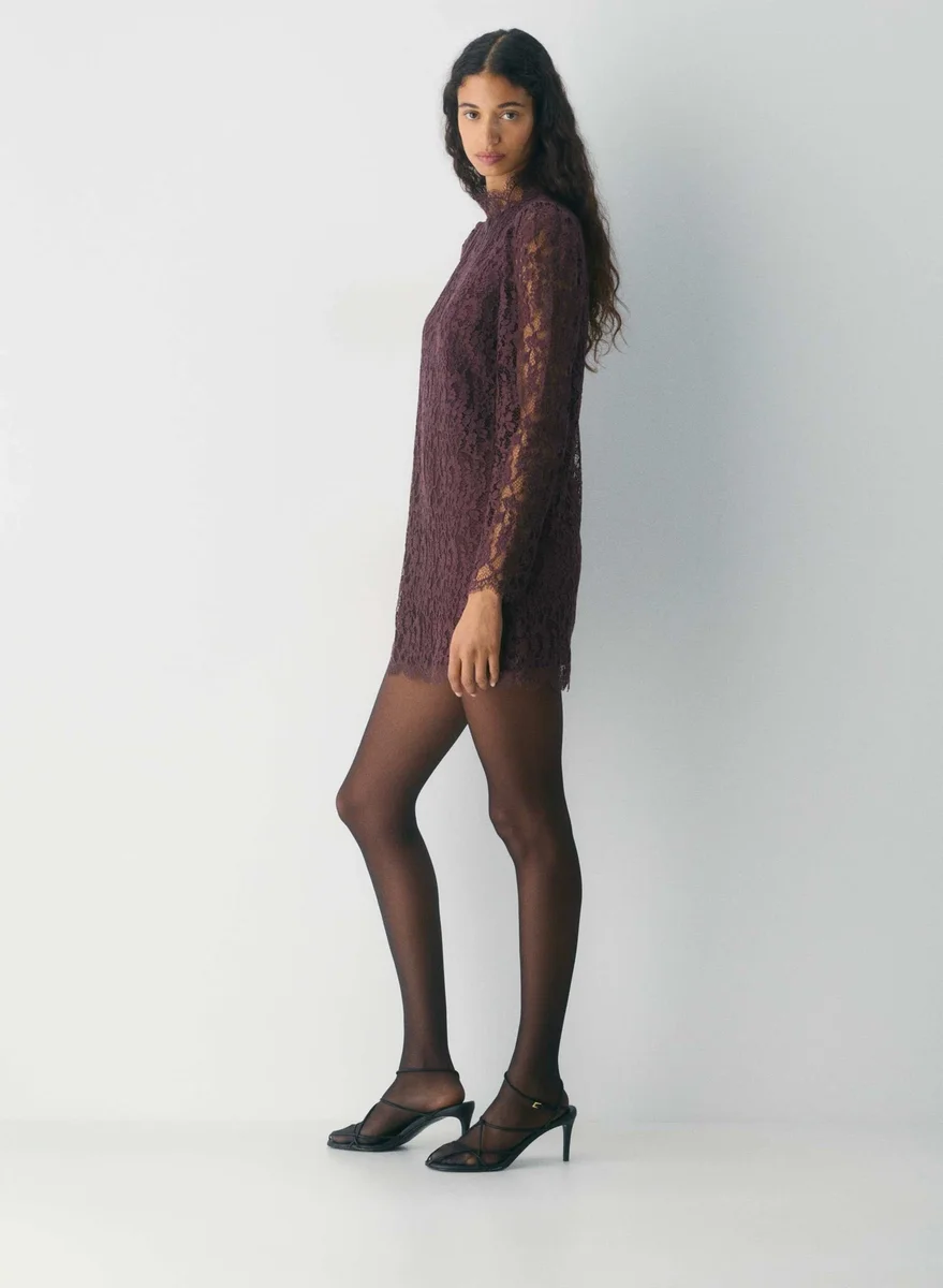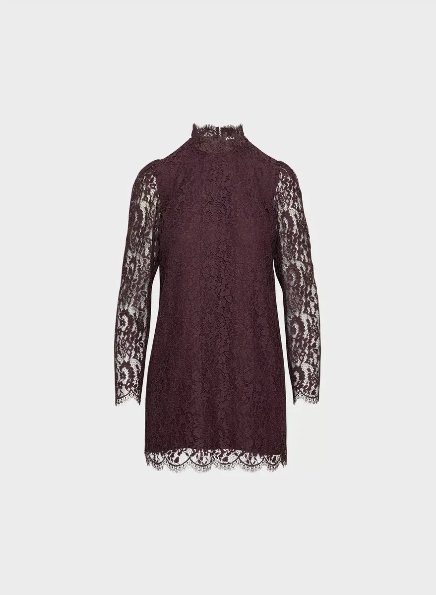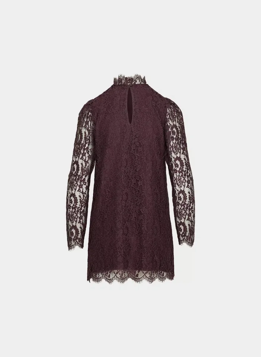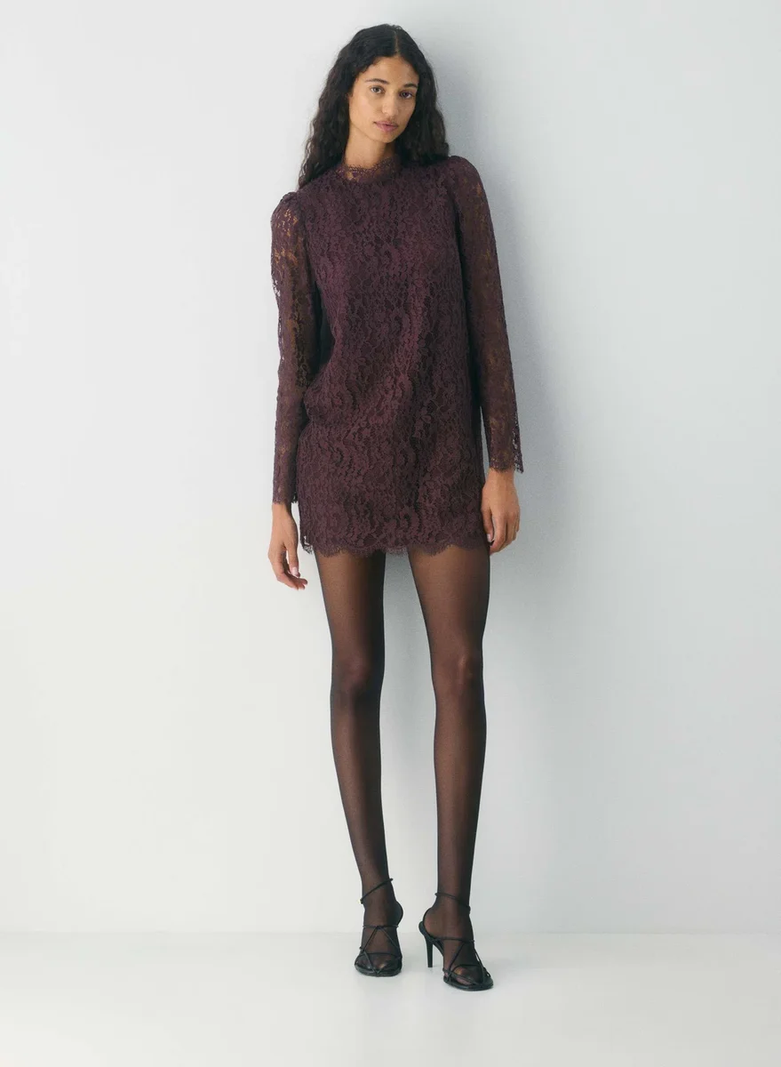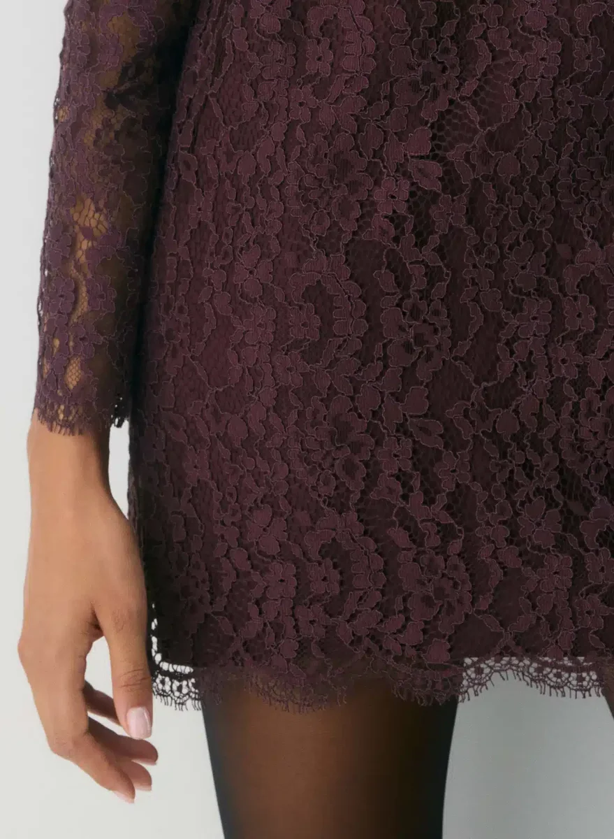 This is a lined micro shift dress with a keyhole cutout at the back. It’s made with scalloped-edge floral lace with a soft feel.