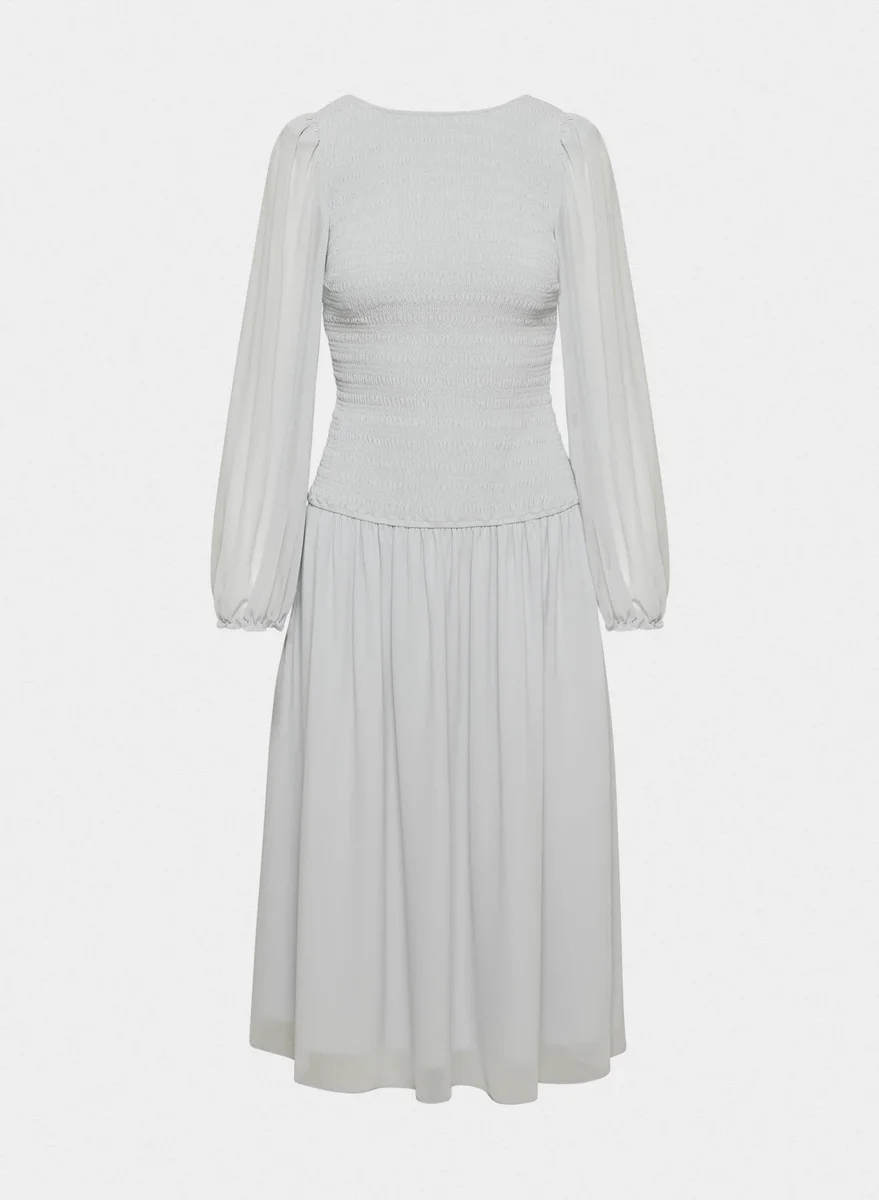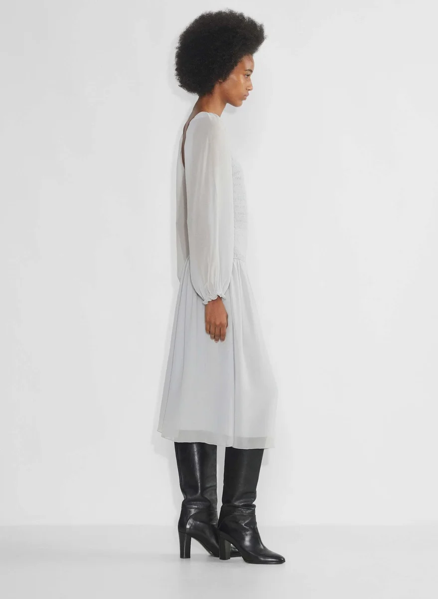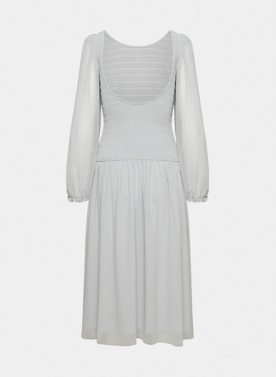 This is a tiered fit-and-flare dress with a dropped waist, a low back and puff sleeves. It’s cut from Fête Chiffon™ — lightweight, semi-sheer fabric with an ethereal drape. This version is made from 100% recycled polyester.