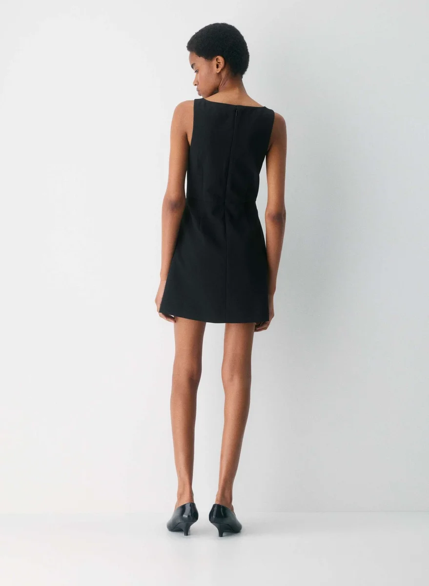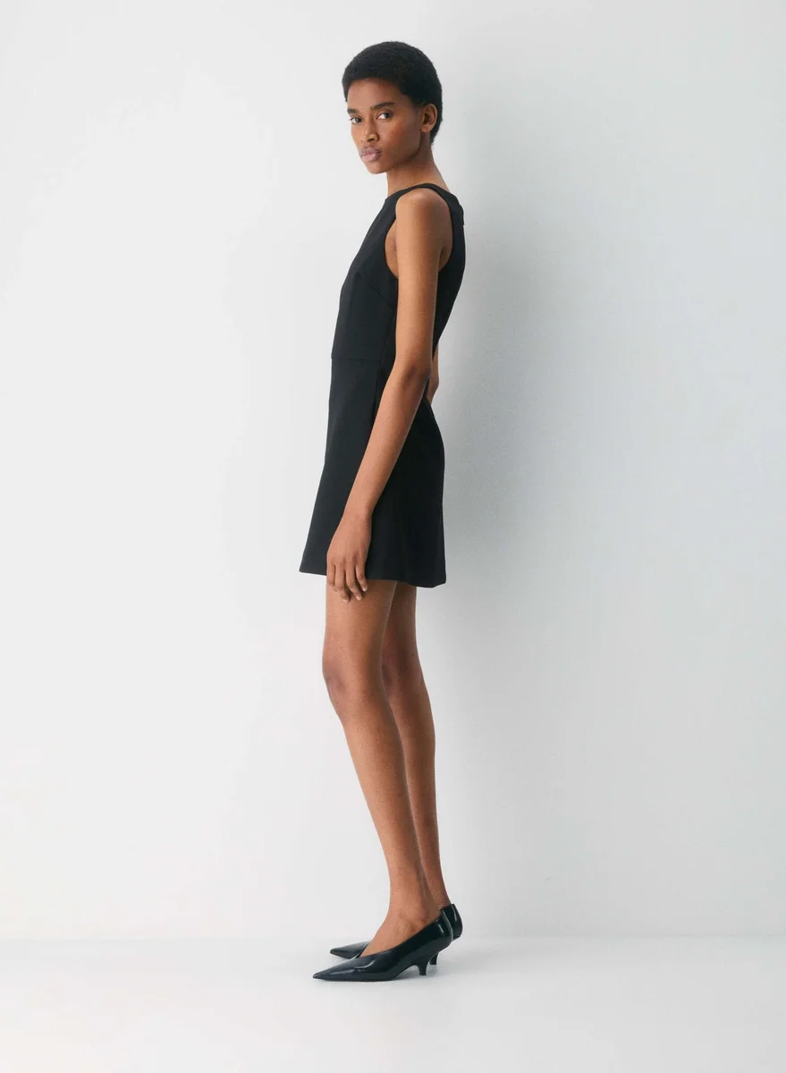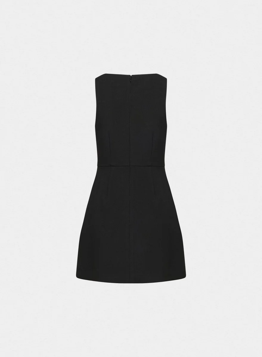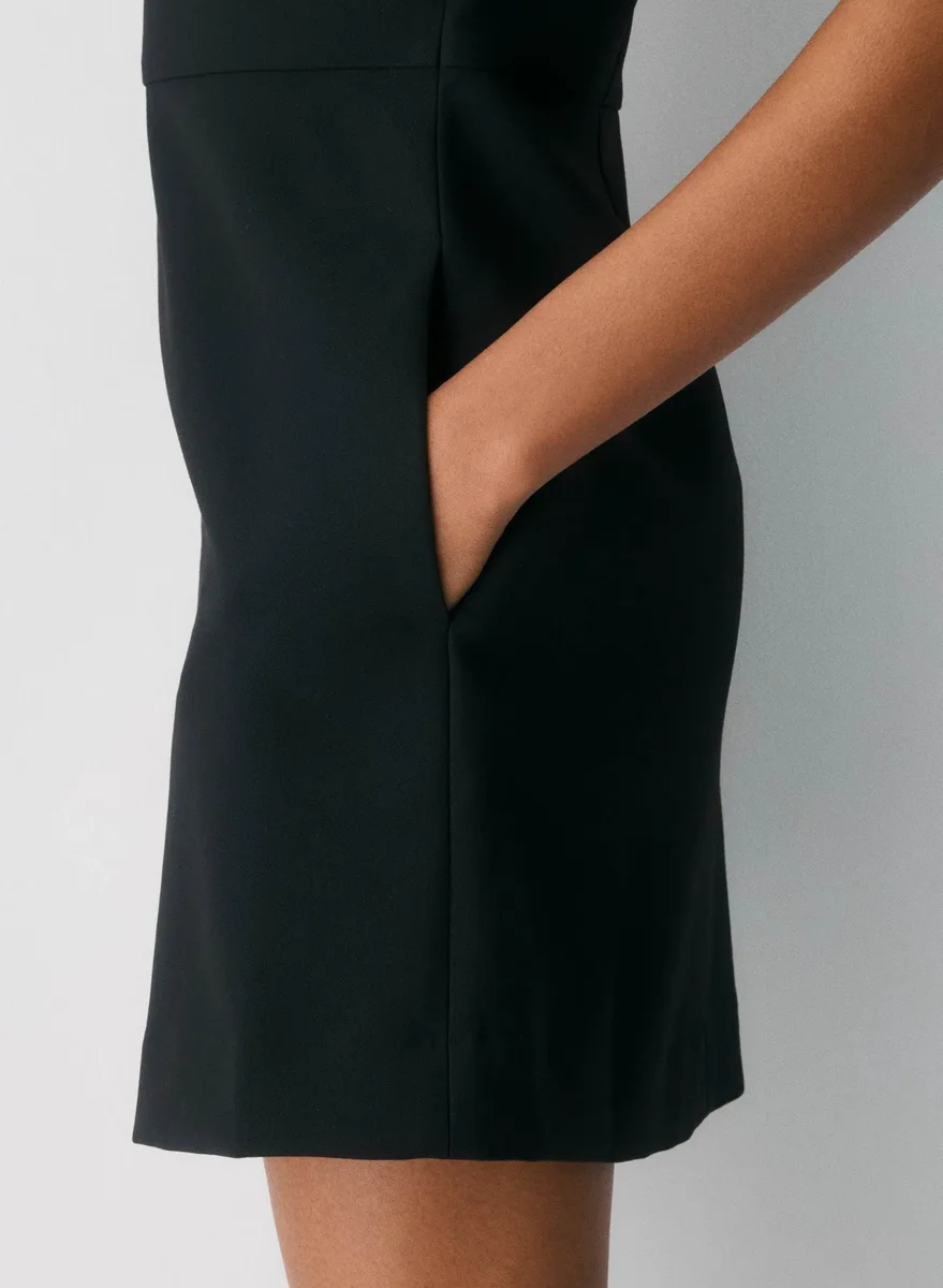 Prefers things shaken, not stirredThis is a lined fit-and-flare mini dress with a boat neckline, inseam pockets and a slim fit. It’s expertly tailored with (Re)ssential — softly structured stretch fabric that holds its form while you move easy. This fabric is sourced from a premier Portuguese mill and made with 54% recycled polyester and 26% LENZING™ ECOVERO™ Viscose.