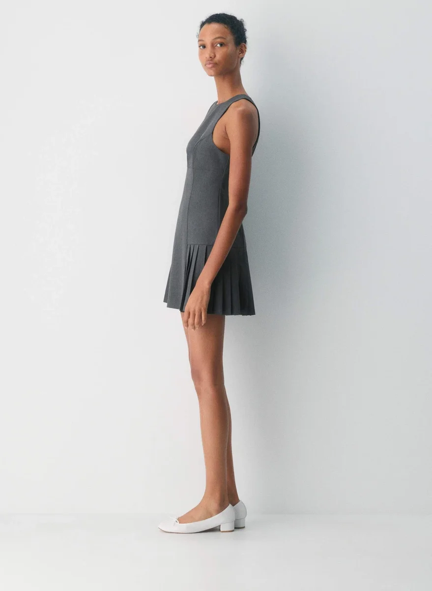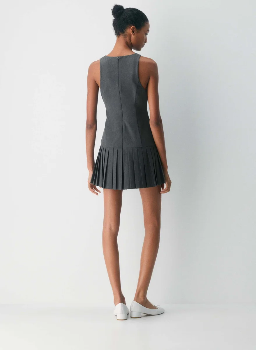 Sweet pleatsThis is a pleated micro dress with a dropped waist and princess seams for shaping. It’s made from softly structured suiting fabric with a smooth feel. This fabric is sourced from a premier Portuguese mill and made with 60% recycled polyester and 29% LENZING™ ECOVERO™ Viscose.