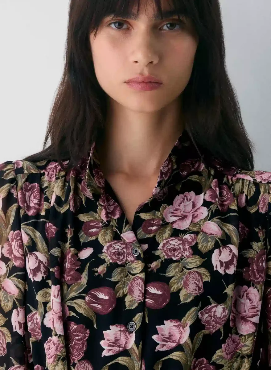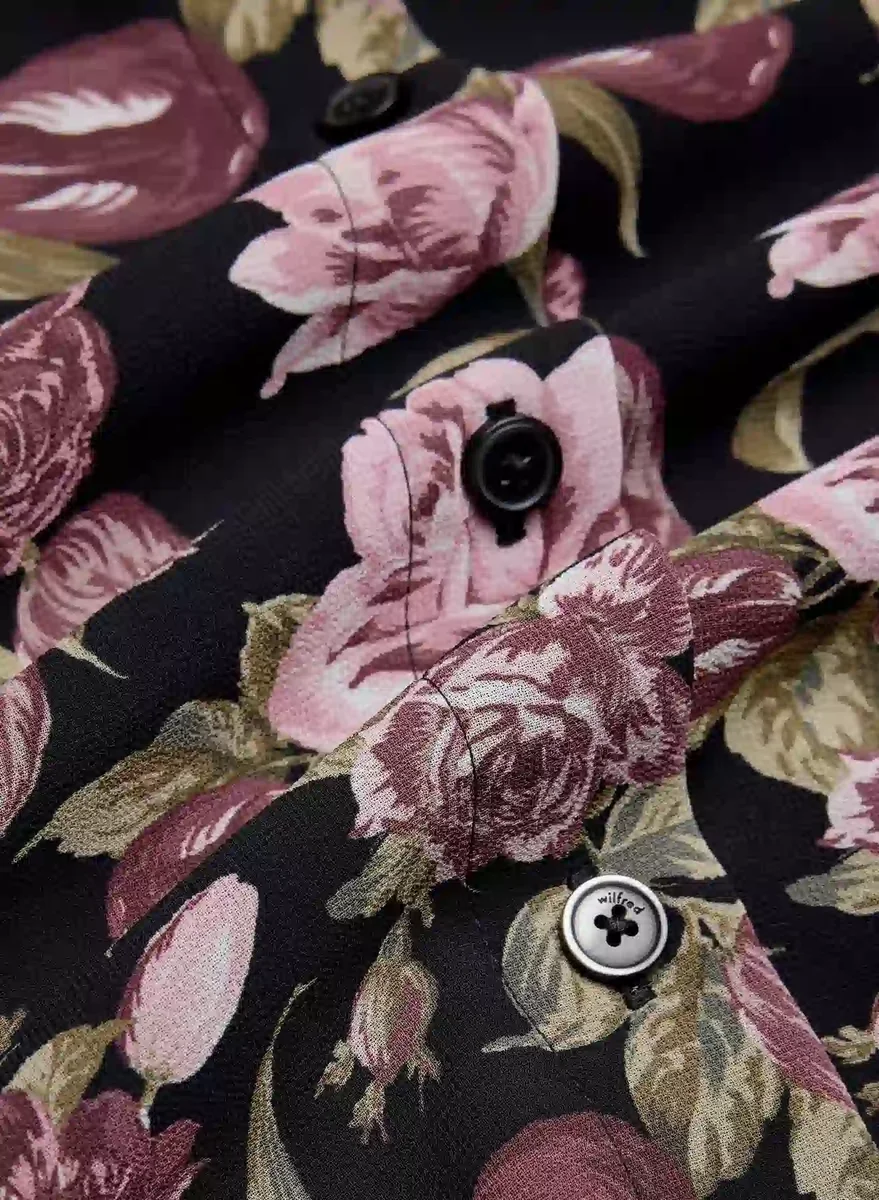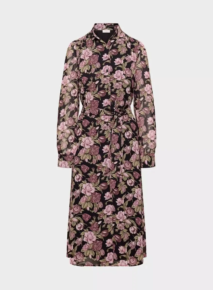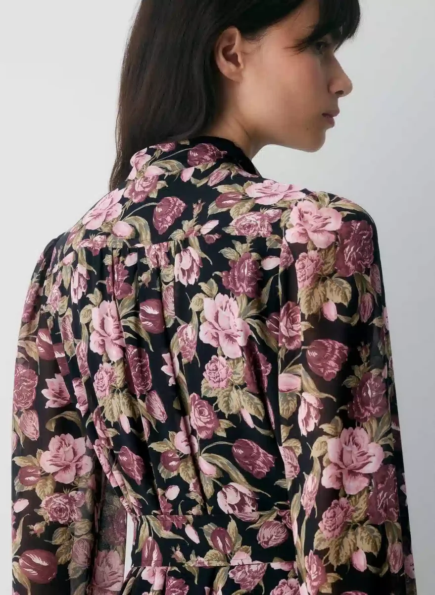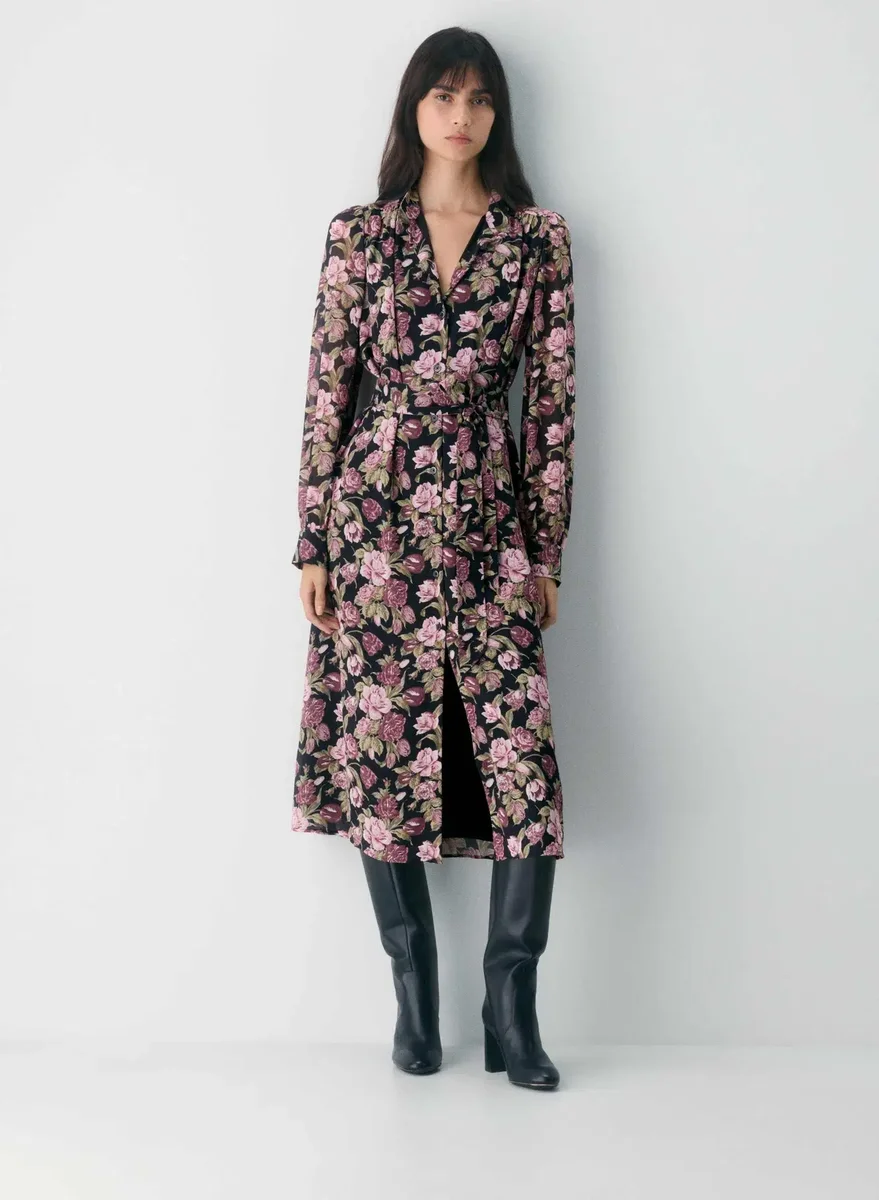 This is a midi shirt dress with a belt. It’s cut from Fête Chiffon™ — lightweight, semi-sheer fabric with an ethereal drape. This version is made from 100% recycled polyester and comes in an exclusive floral print designed in-house.