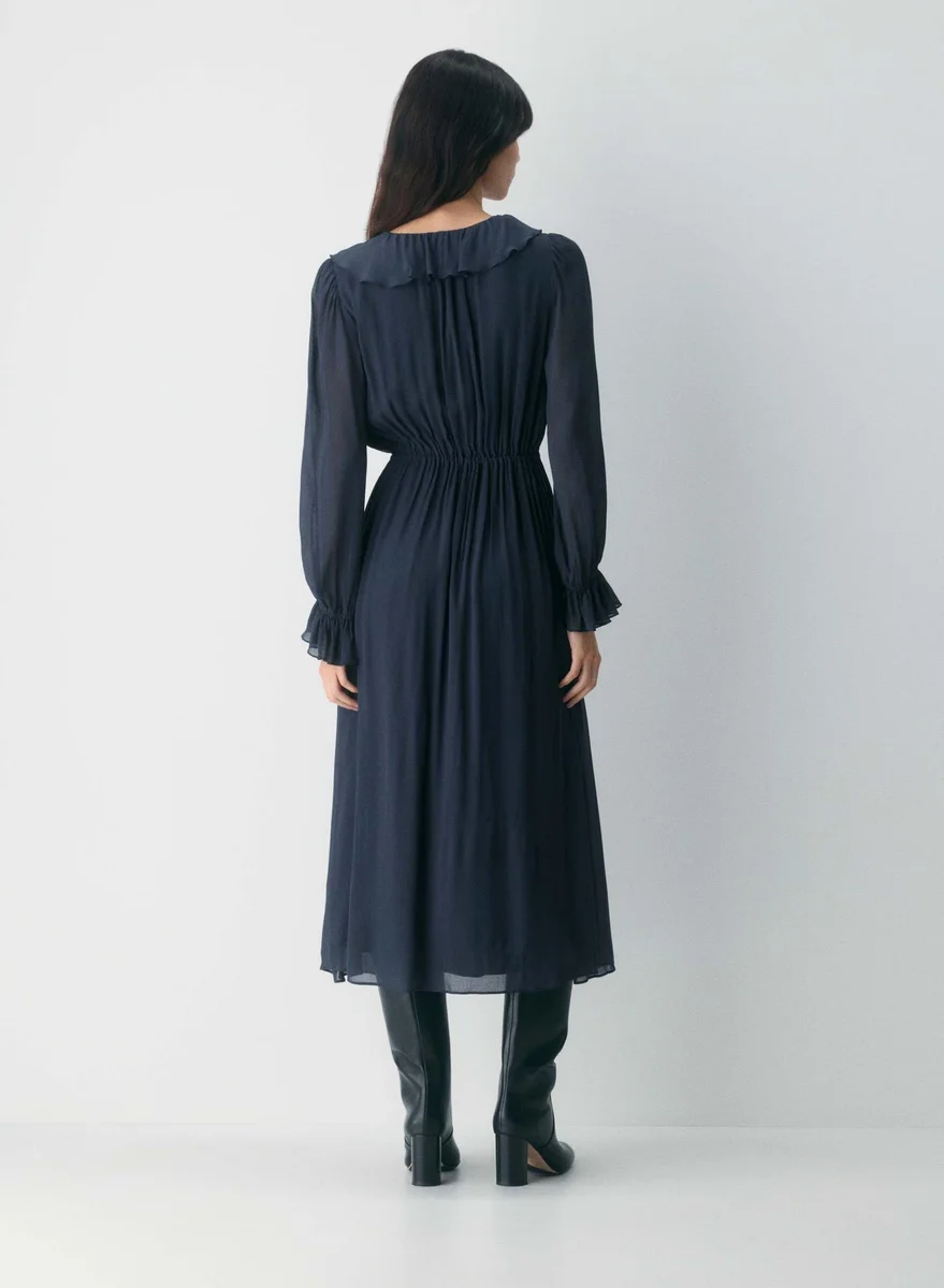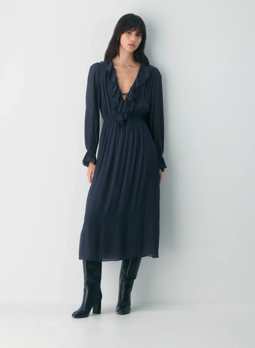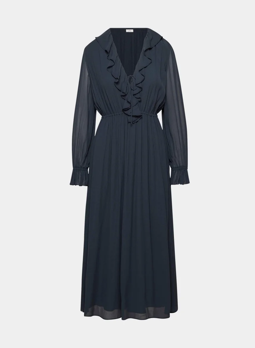 This is a V-neck maxi dress with ruffles. It’s crafted from semi-sheer chiffon with a crinkled texture and soft drape. This fabric is made with 55% LENZING™ ECOVERO™ Viscose.