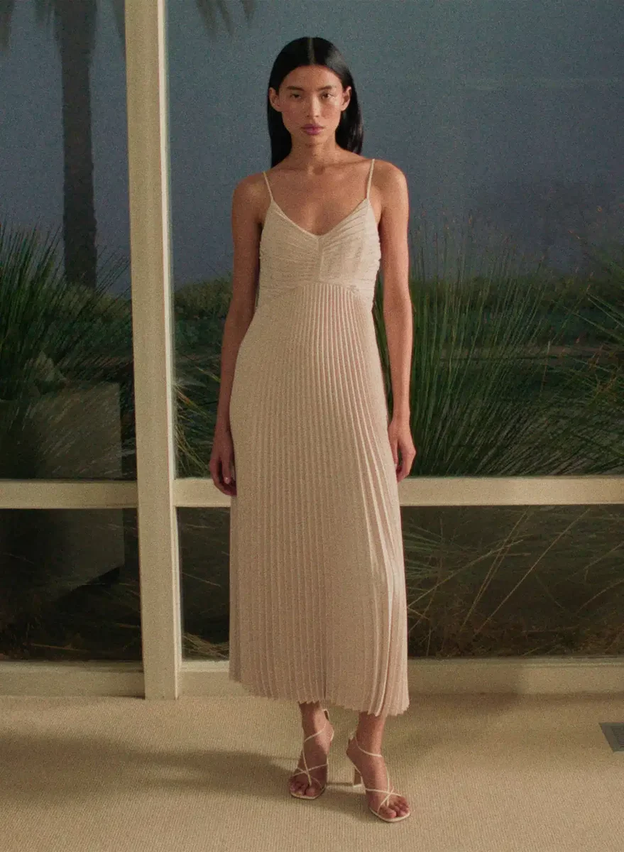 This is a pleated maxi dress with a V neckline and adjustable straps. It’s cut from Studio Drape — drapey matte satin with a smooth look and lightweight feel. This fabric is made with recycled polyester.