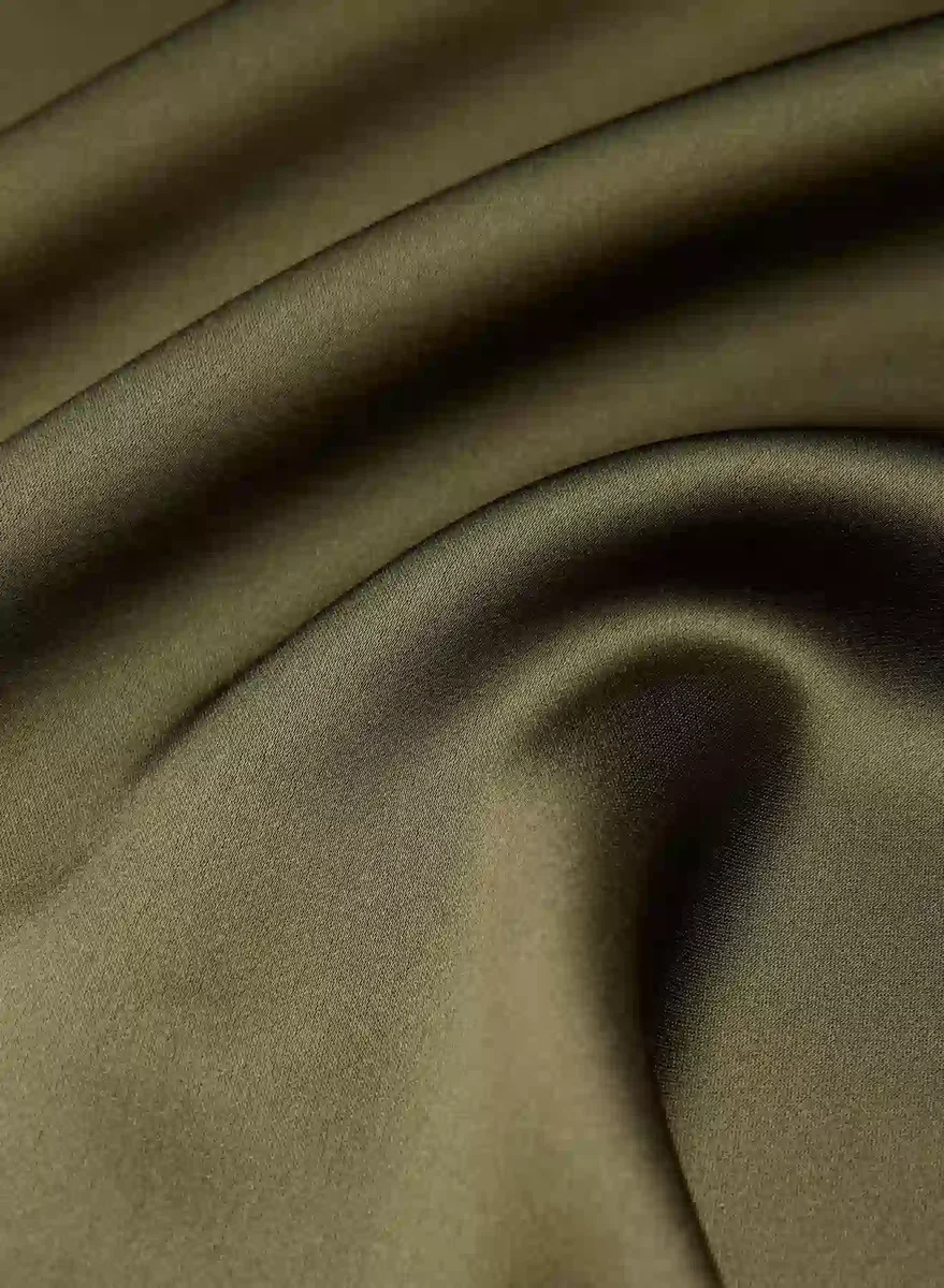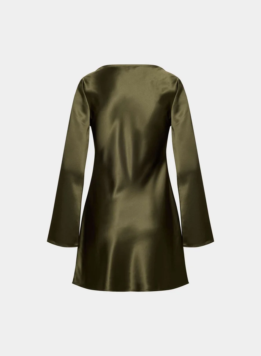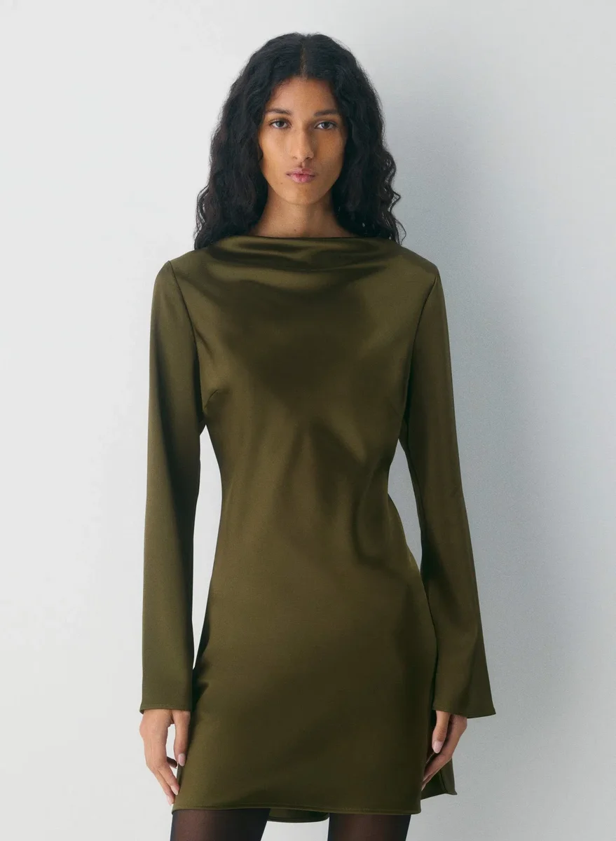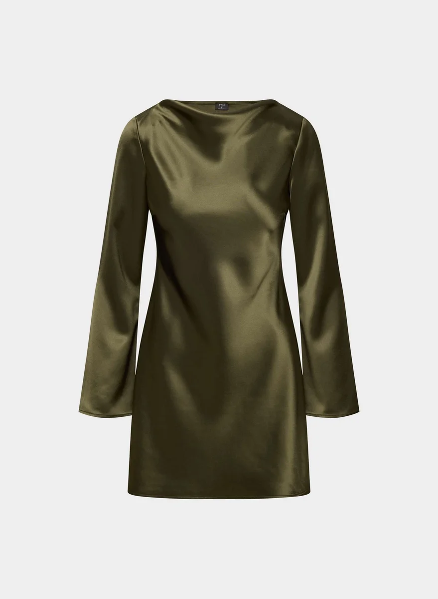 This is a boatneck mini dress. It’s made from double-faced satin with a soft sheen and luxurious next-to-skin feel. This fabric is made with 80% Naia™ Acetate.