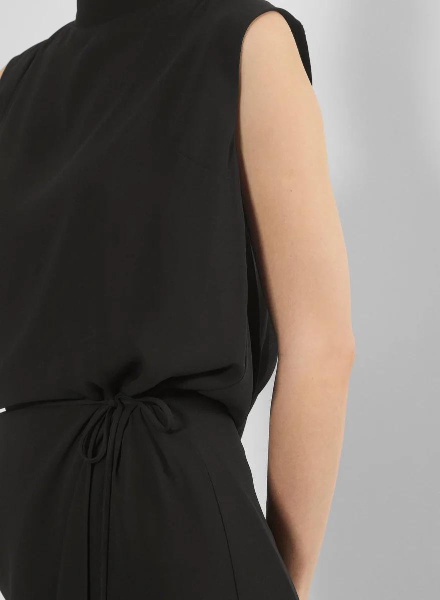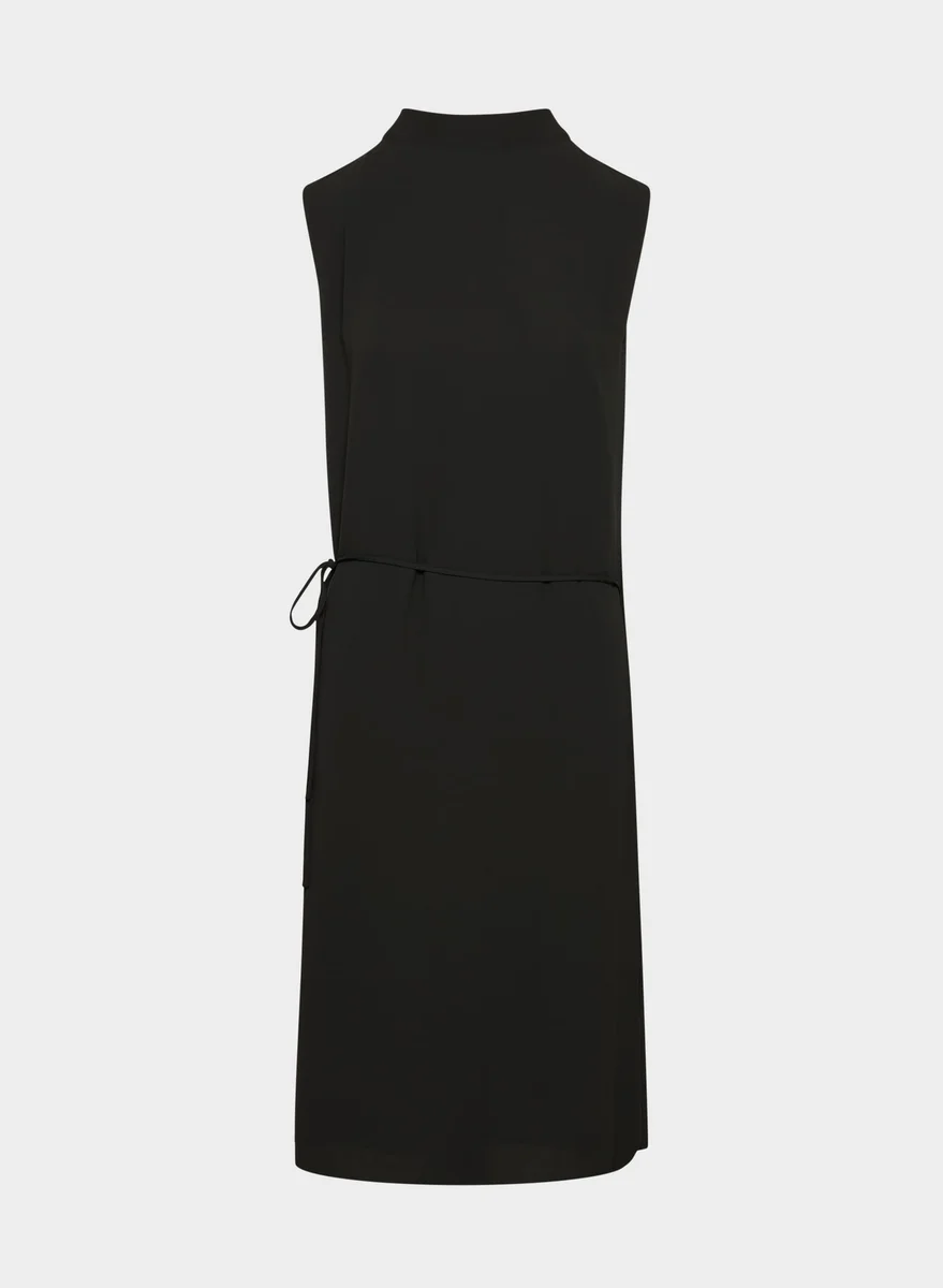 Business in the front, etc.This is a cowlneck dress with open back, waist tie detail and wrap construction. It’s made from lightweight crepe fabric with a satin back and luxuriously smooth next-to-skin feel.