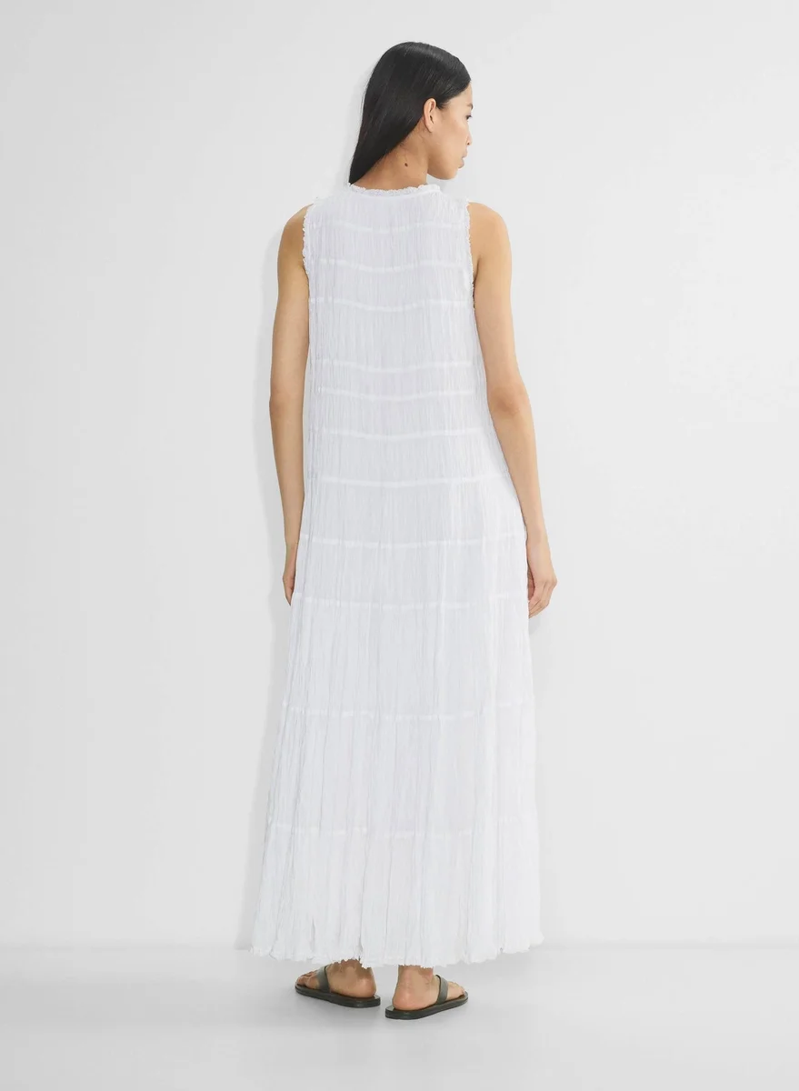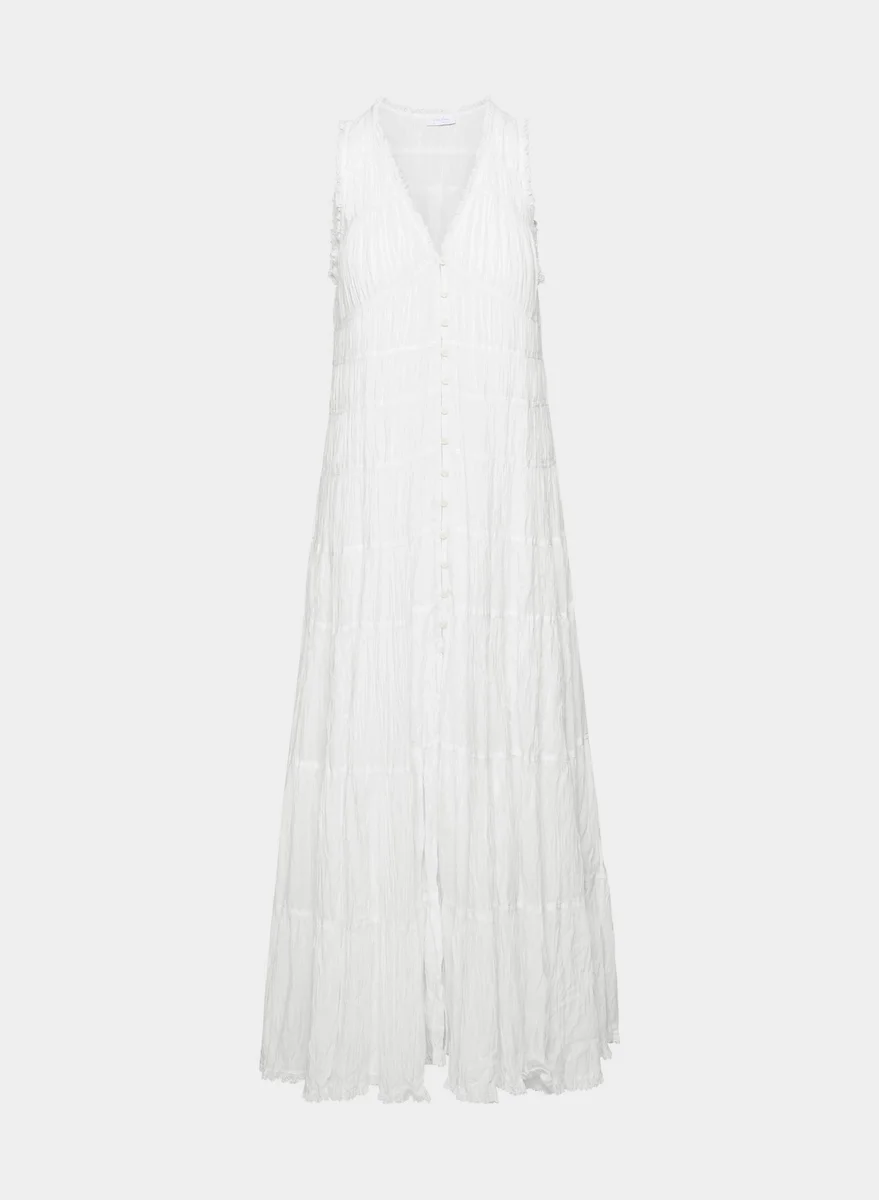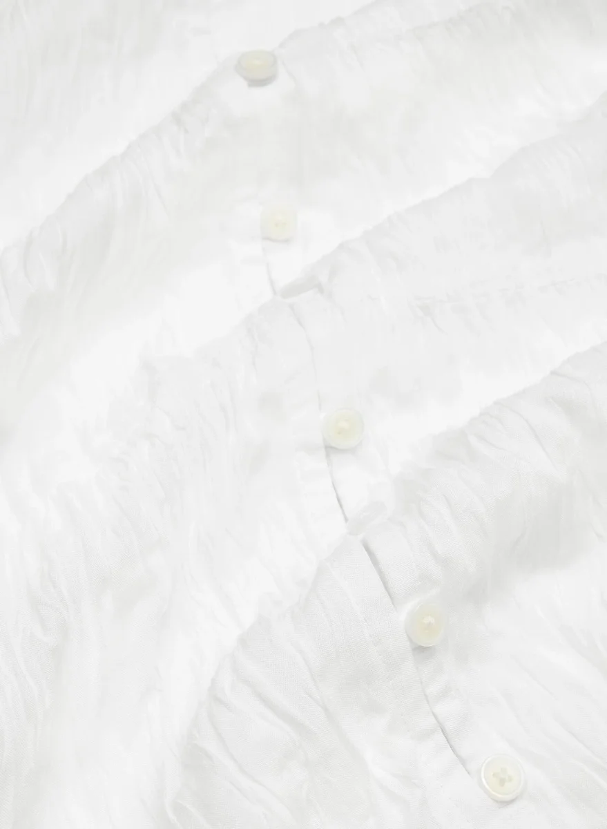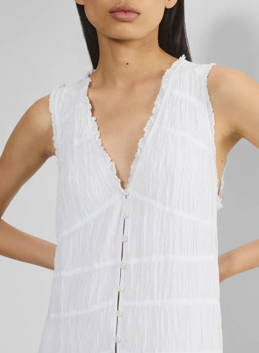 This is a tiered button-up dress with a V neckline and lace trim. It’s made from lightweight, drapey fabric with a crinkled texture and soft, airy feel. This fabric is made with TENCEL™ Modal.
