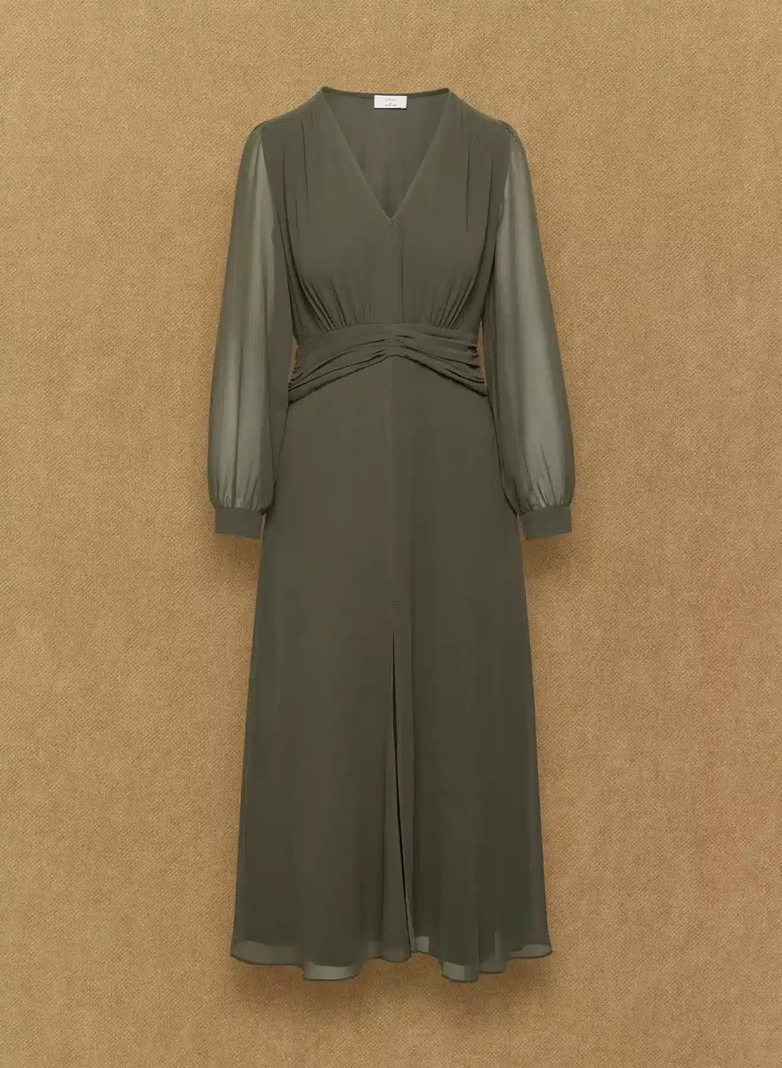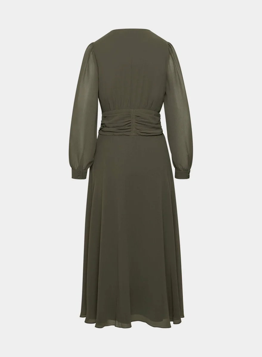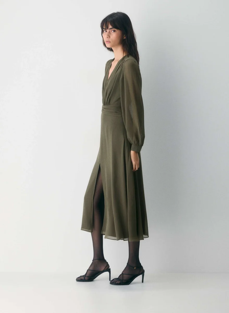 Like they used toThis is a longsleeve fit-and-flare dress with a V neckline and front slit. It’s made from Fête Chiffon™ — lightweight, semi-sheer fabric with an ethereal drape. This version is made from 100% recycled polyester.