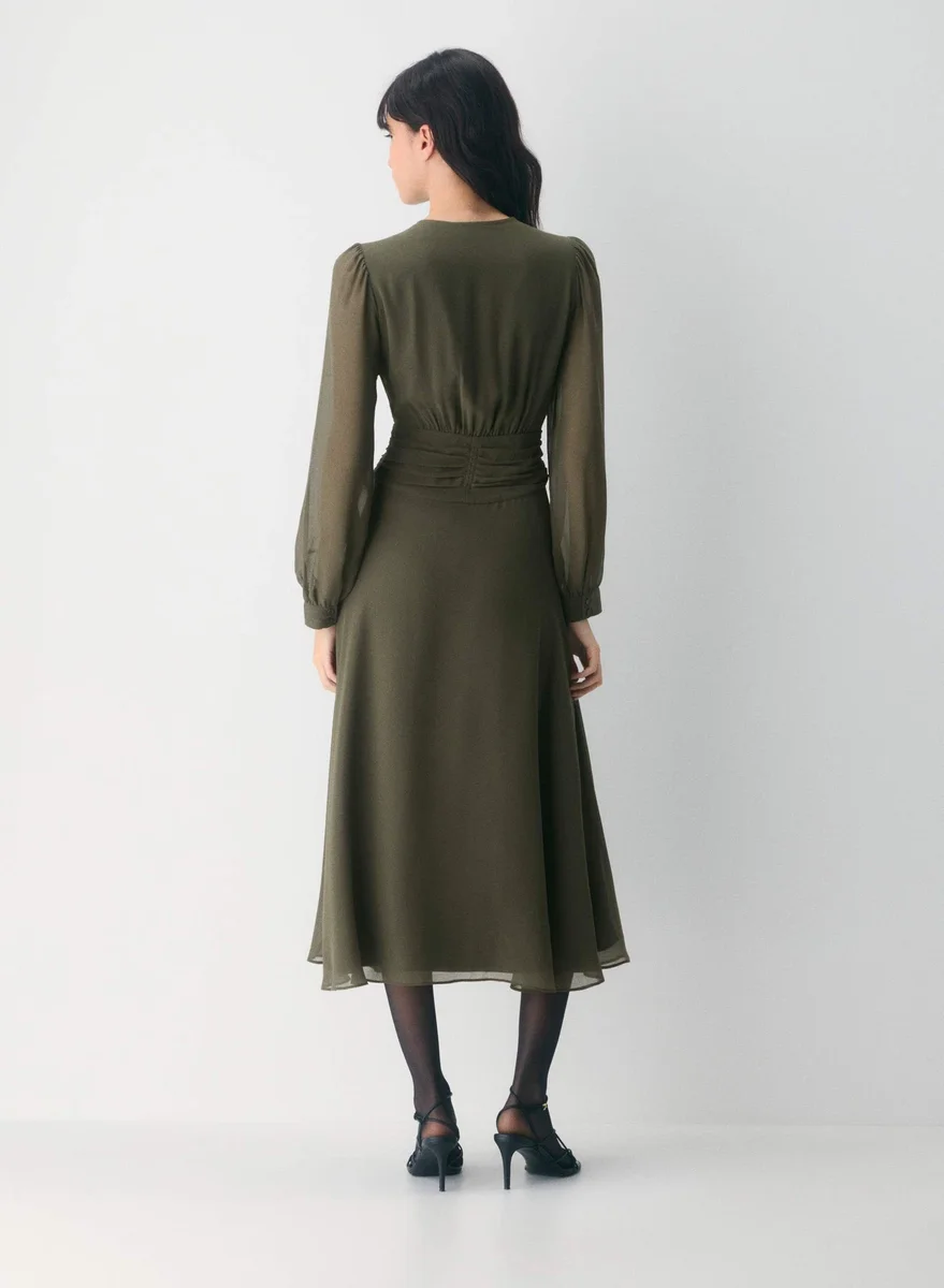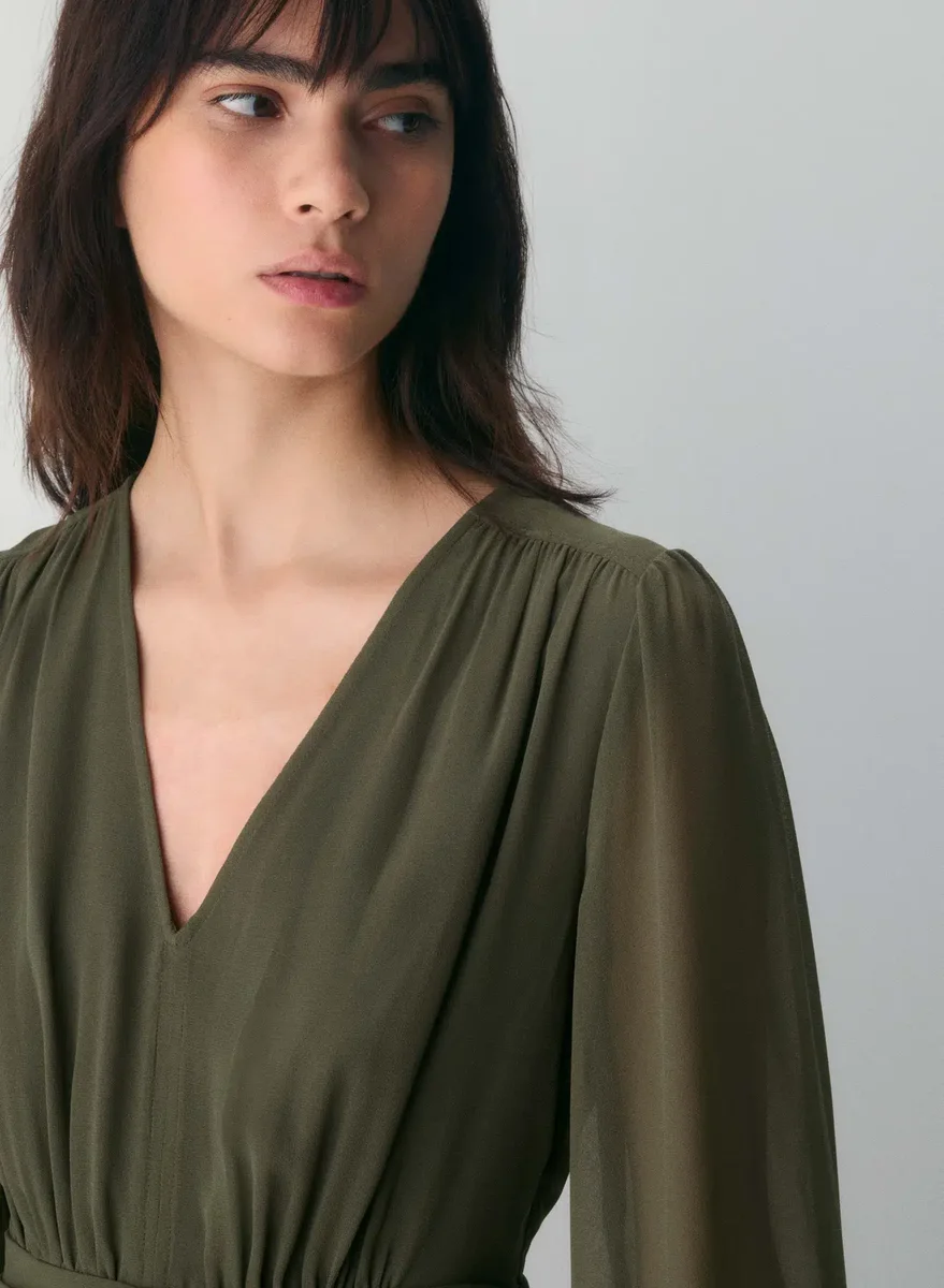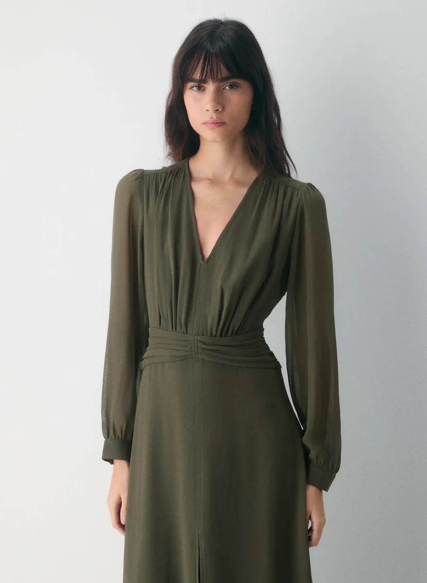 Like they used toThis is a longsleeve fit-and-flare dress with a V neckline and front slit. It’s made from Fête Chiffon™ — lightweight, semi-sheer fabric with an ethereal drape. This version is made from 100% recycled polyester.