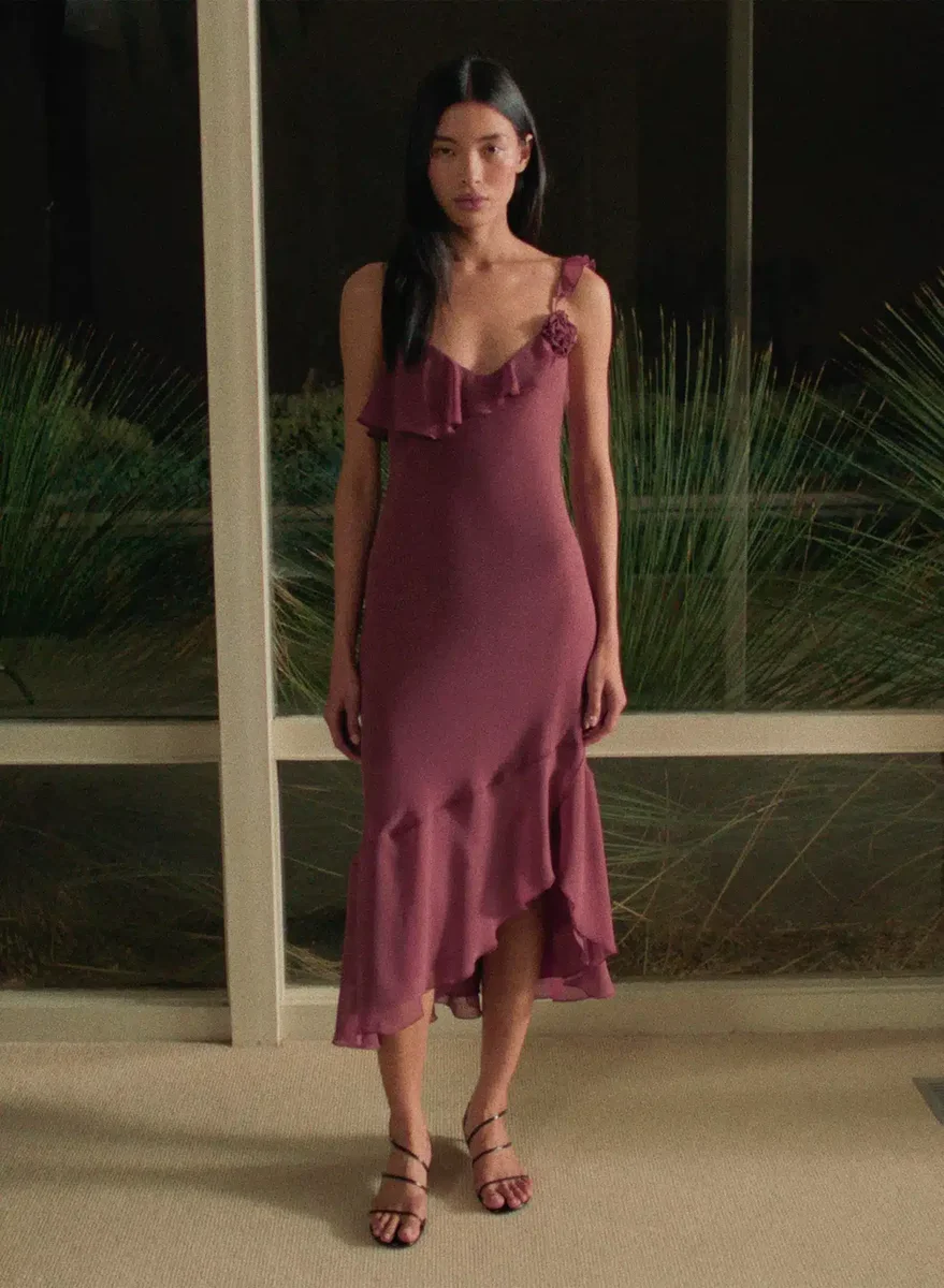 This is a ruffled fit-and-flare dress with adjustable straps and a rosette detail. It’s made with Fête Chiffon™ — lightweight, semi-sheer fabric with an ethereal drape. This version is made from 100% recycled materials.