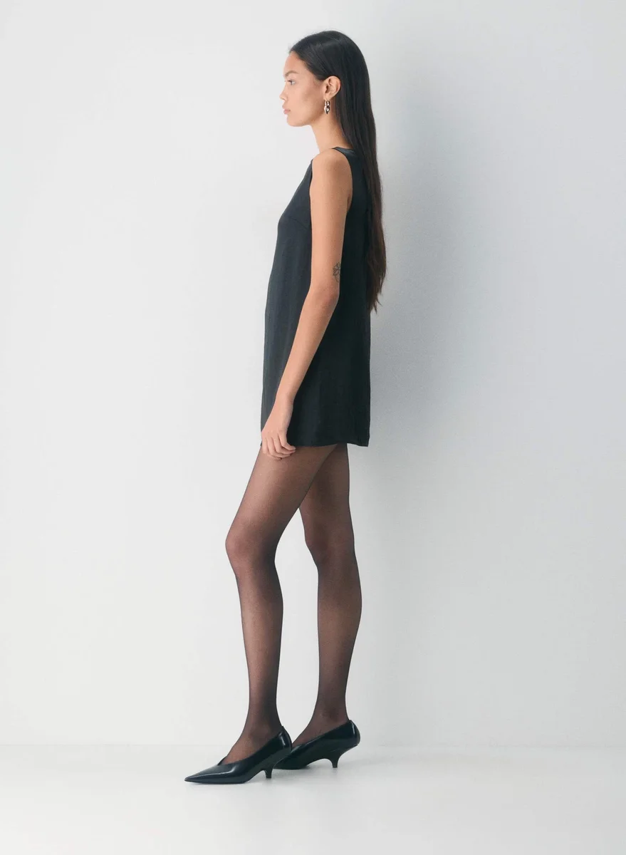 That ’90s kind of slinkyThis is a boatneck micro shift dress. It’s cut from drapey Japanese satin with a high sheen and vintage finish for a crinkled look and feel. This fabric is made with 100% NAIA™ Renew acetate.