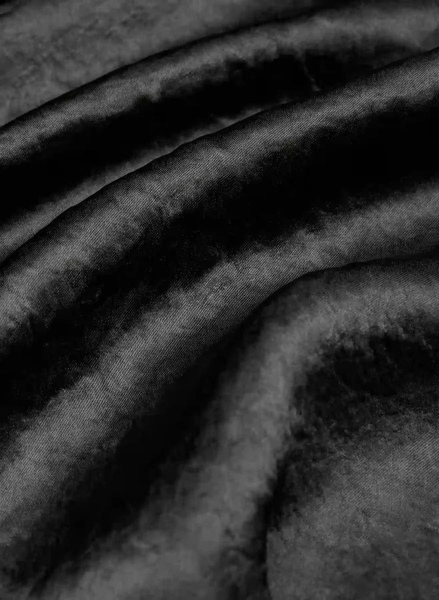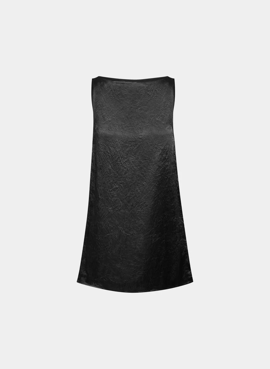 That ’90s kind of slinkyThis is a boatneck micro shift dress. It’s cut from drapey Japanese satin with a high sheen and vintage finish for a crinkled look and