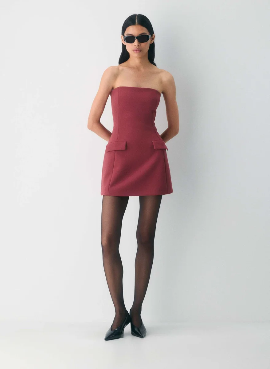 This is a lined, strapless micro dress with welt hand pockets and princess seams for shaping. It’s made with FigureKnit™ — structured, double-layer crepe fabric that delivers superior stretch and shape retention to hug your figure.