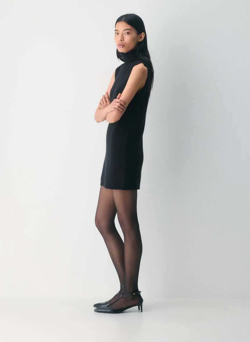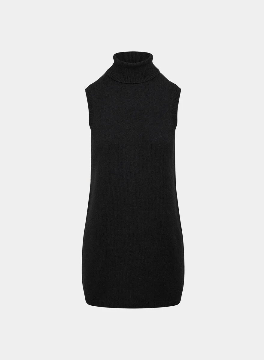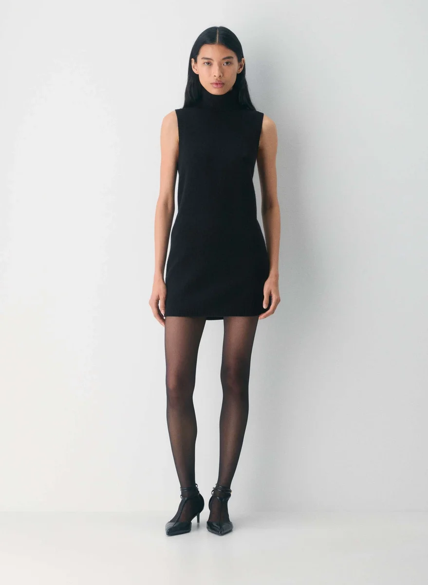 Your new favourite layering pieceThis is a sleeveless sweater dress with a turtleneck collar and micro length. It’s knit with a lofty, spongey yarn that’s