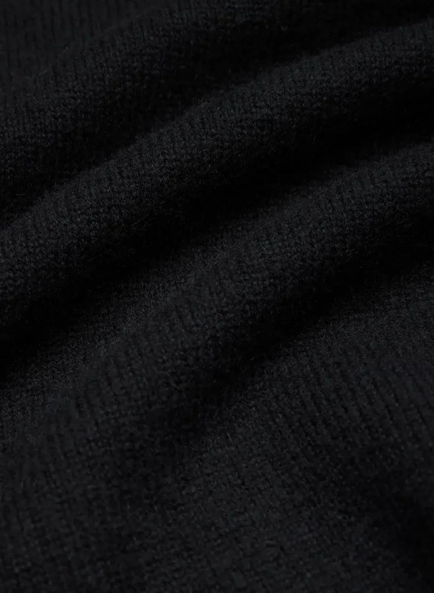 This is a sleeveless sweater dress with a turtleneck collar and micro length. It’s knit with a lofty, spongey yarn that’s naturally warm and luxuriously soft. The yarn is made with cashmere verified to The Good Cashmere Standard® by AbTF and responsibly sourced wool. It’s constructed with a Jersey stitch for a soft drape and a smooth, flat feel.