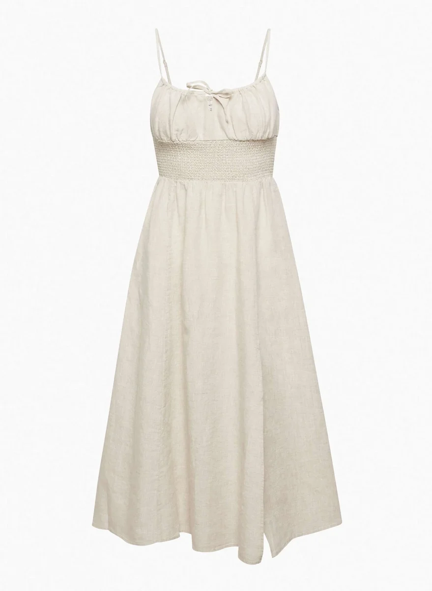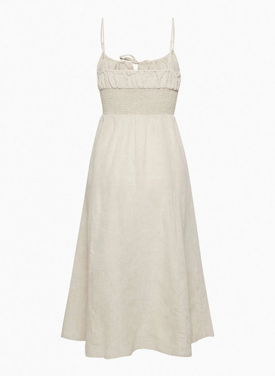 This is a smocked-waist midi dress with a thigh slit and keyhole cutout. It’s made with airy 100% organic linen with a subtle texture.