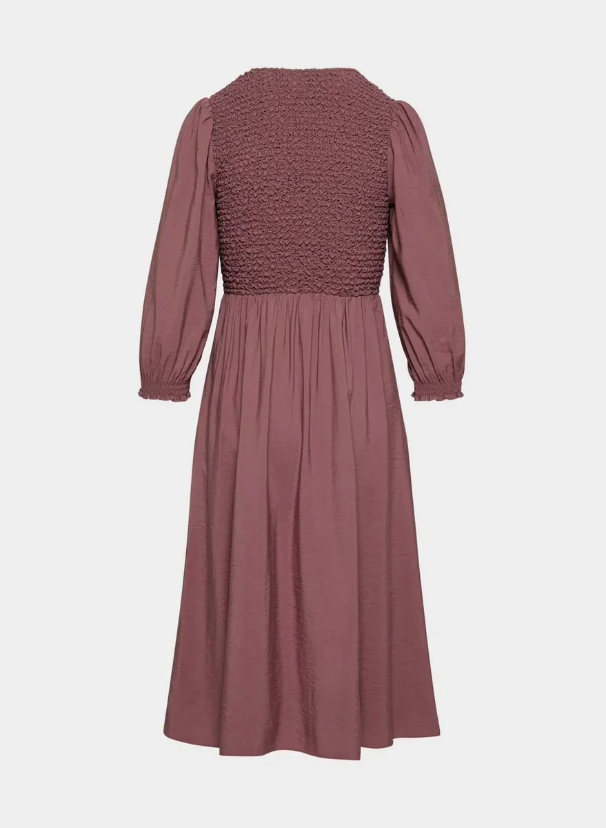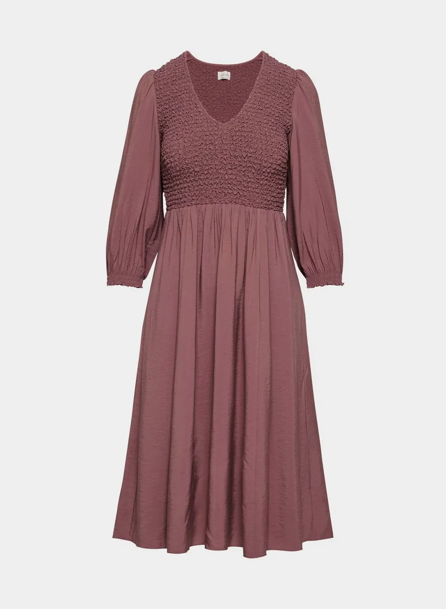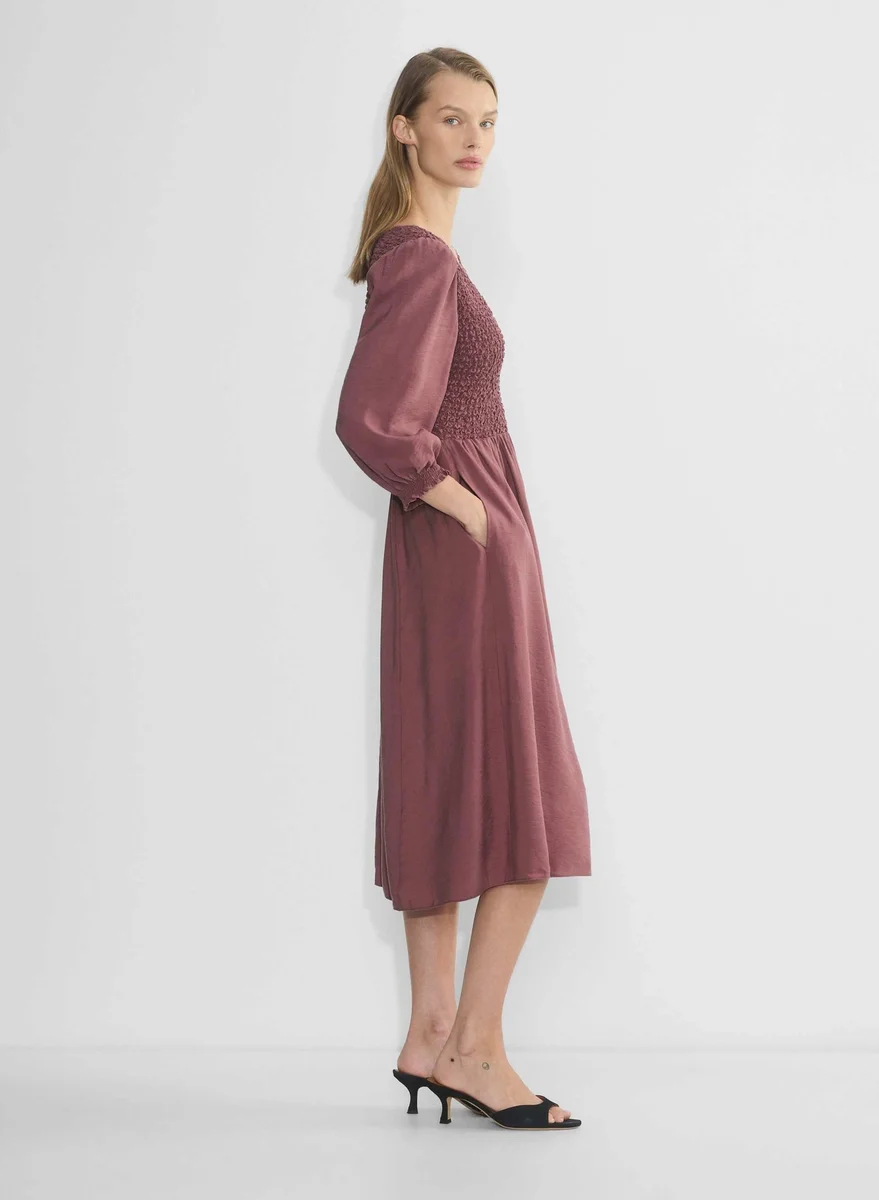 This is a fit-and-flare midi dress with a flattering smocked bodice and puff sleeves. It’s made from lightweight, drapey fabric with a soft crinkle texture. This fabric is made with LENZING™ ECOVERO™ Viscose.