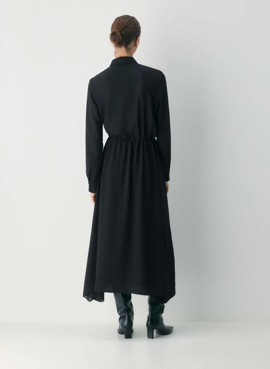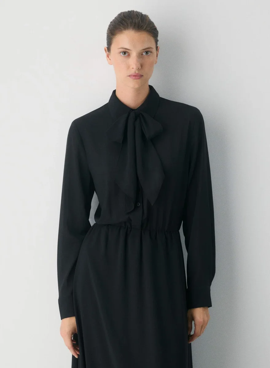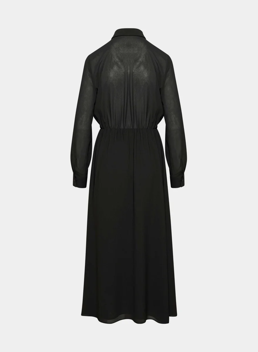 Power dressingThis is a button-up midi shirt dress with a tie neck. It’s made with Fête Chiffon™ — lightweight, semi-sheer fabric with an ethereal drape. This version is made with 55% recycled polyester.