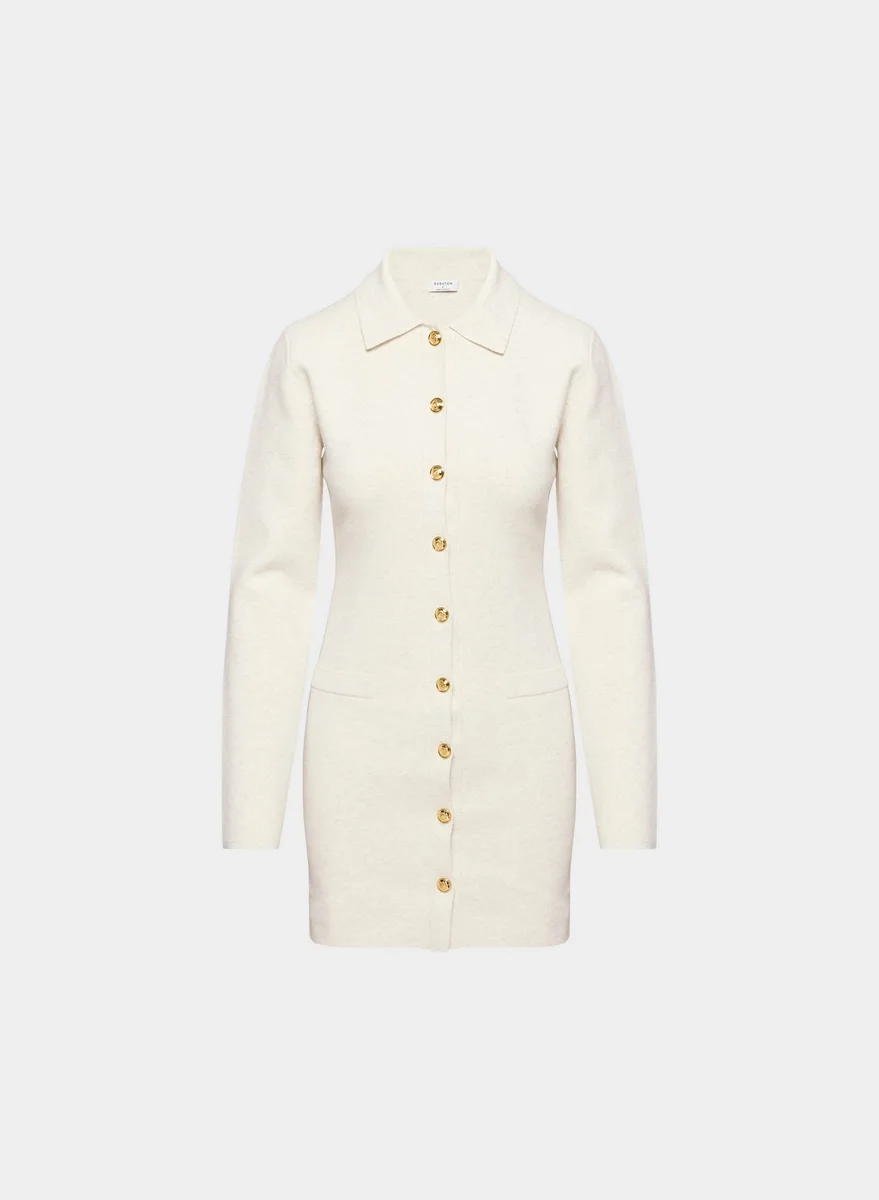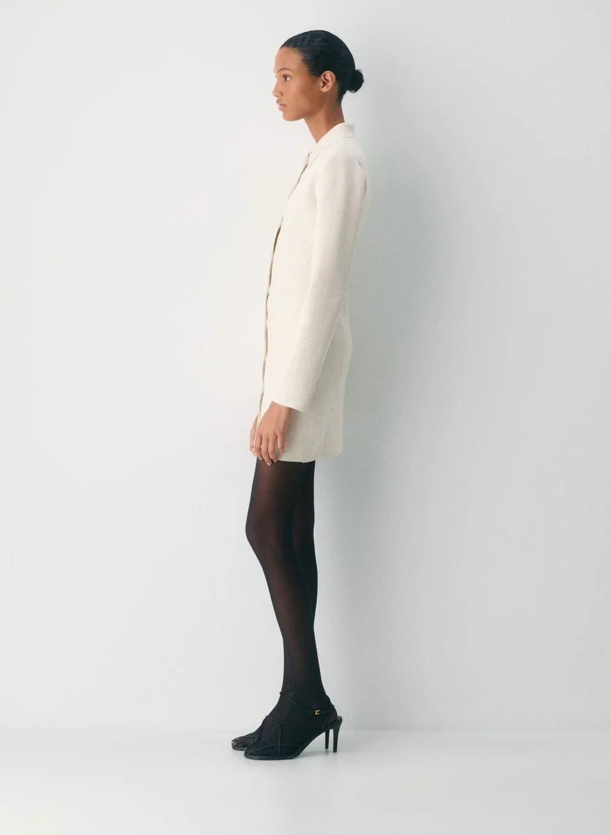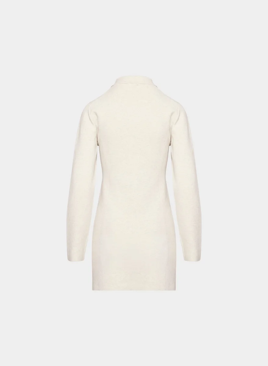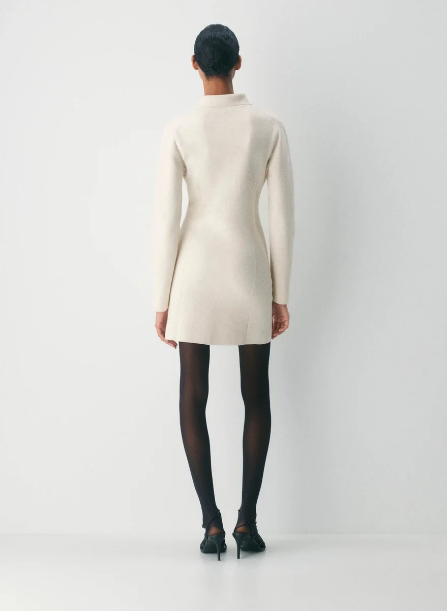 This is a collared micro dress with a slim fit and button closure. It’s knit with Wonder Yarn — the lightweight yarn that lives up to its name. This fabric offers the peachy softness of wool, without the wool. It’s made with LENZING™ ECOVERO™ Viscose. This garment is constructed using a Full Milano stitch with a double-layer structure for a flat, dense feel.