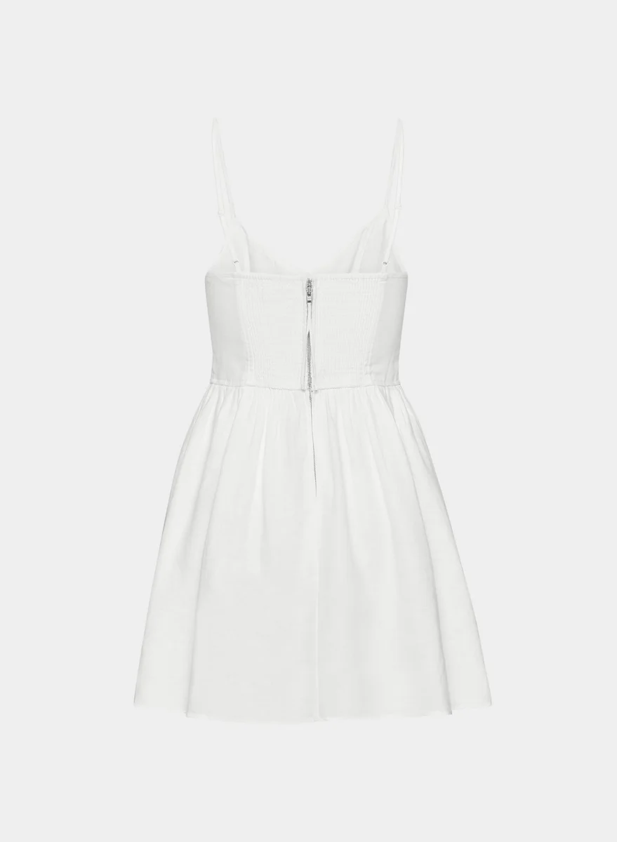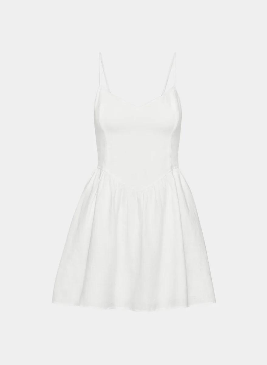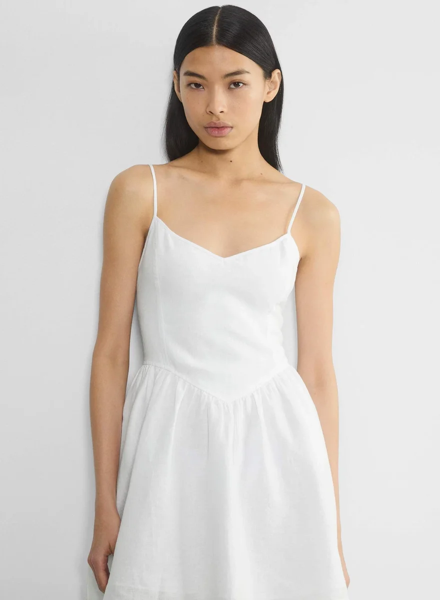 This is a fit-and-flare mini dress with a sweetheart neckline, adjustable straps and a smocked back panel. It’s made from breathable 100% organic linen with a natural texture and soft, airy feel.