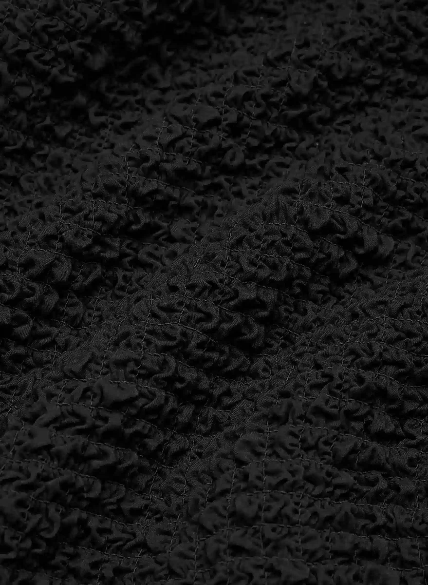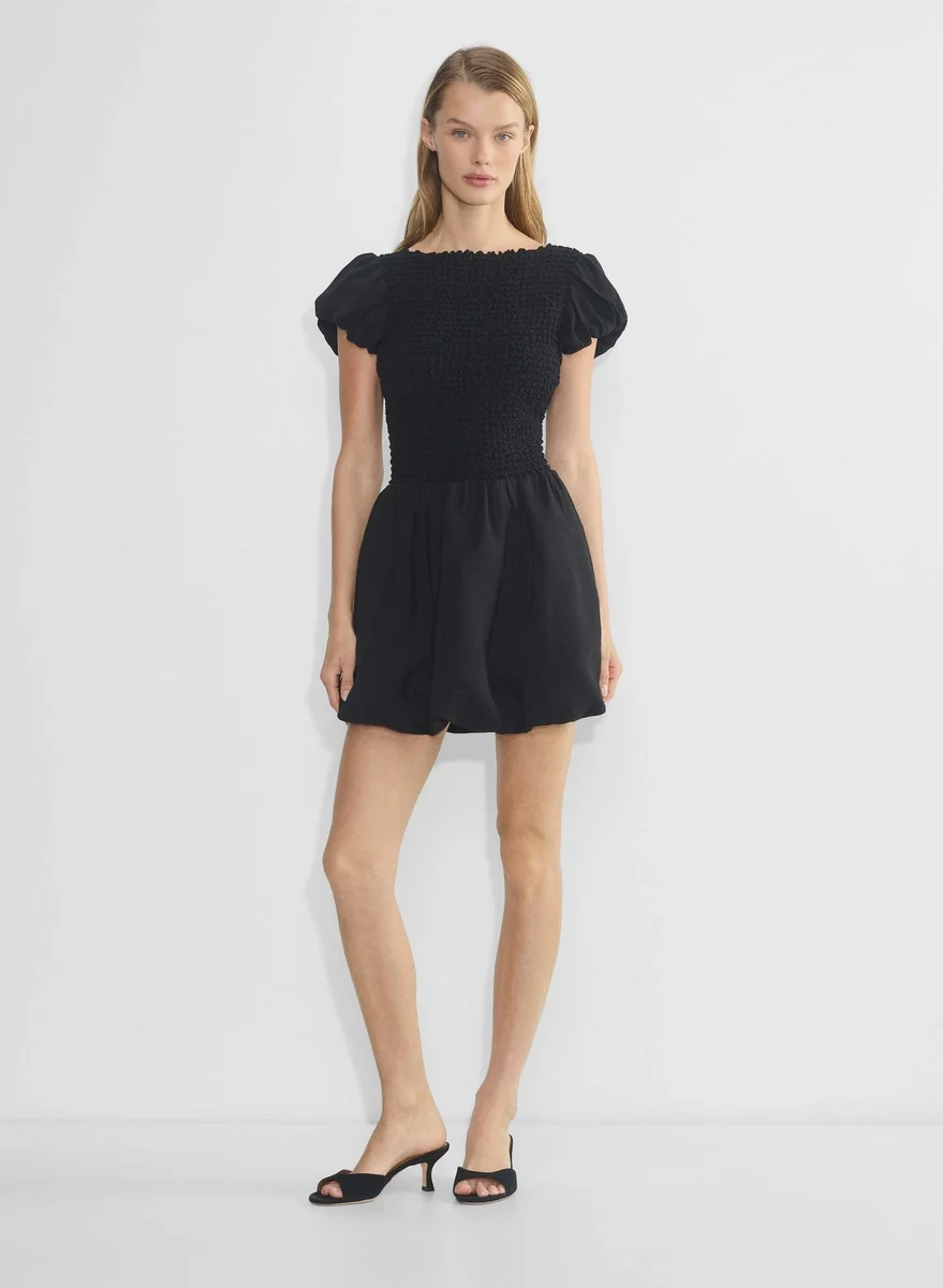 This is a mini bubble dress with a smocked bodice and inseam pockets. It’s made from lightweight, drapey fabric with a soft crinkle texture. This fabric is made with LENZING™ ECOVERO™ Viscose.