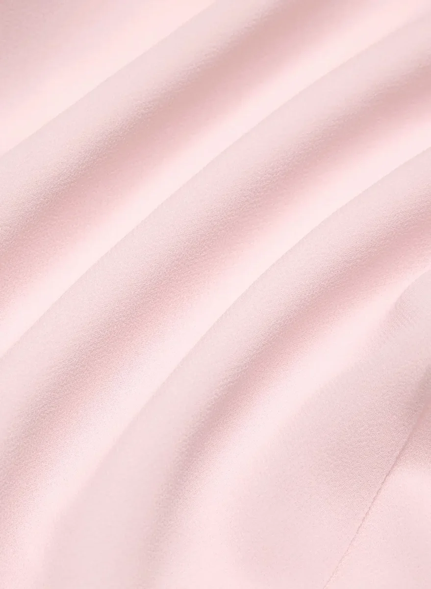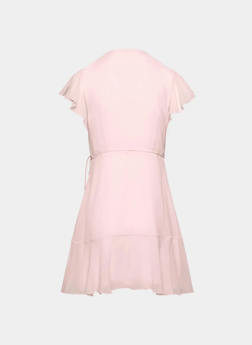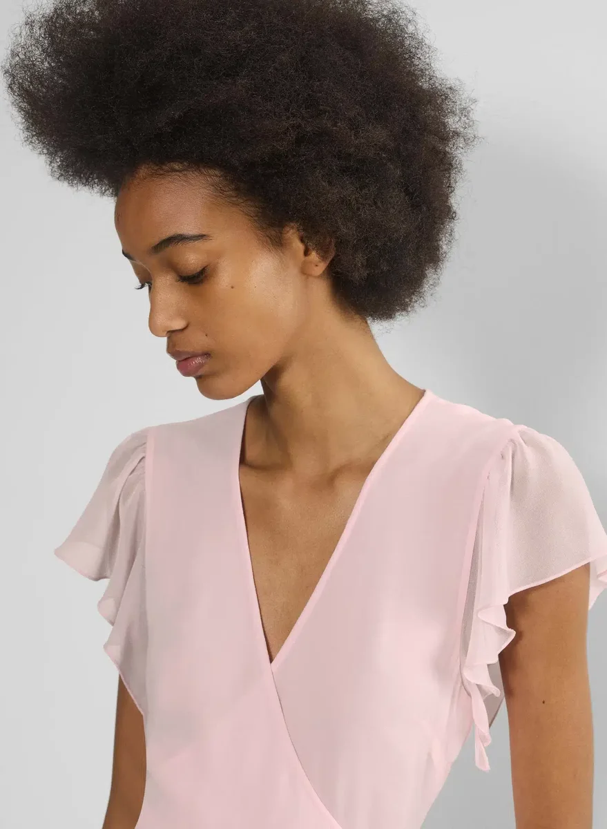 This is a V-neck wrap dress with a ruffled hem and a self tie. It’s made with Fête Chiffon™ — lightweight, semi-sheer fabric with an ethereal drape. This version is made from 100% recycled materials.