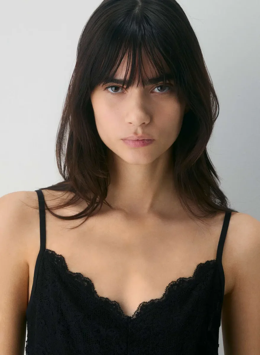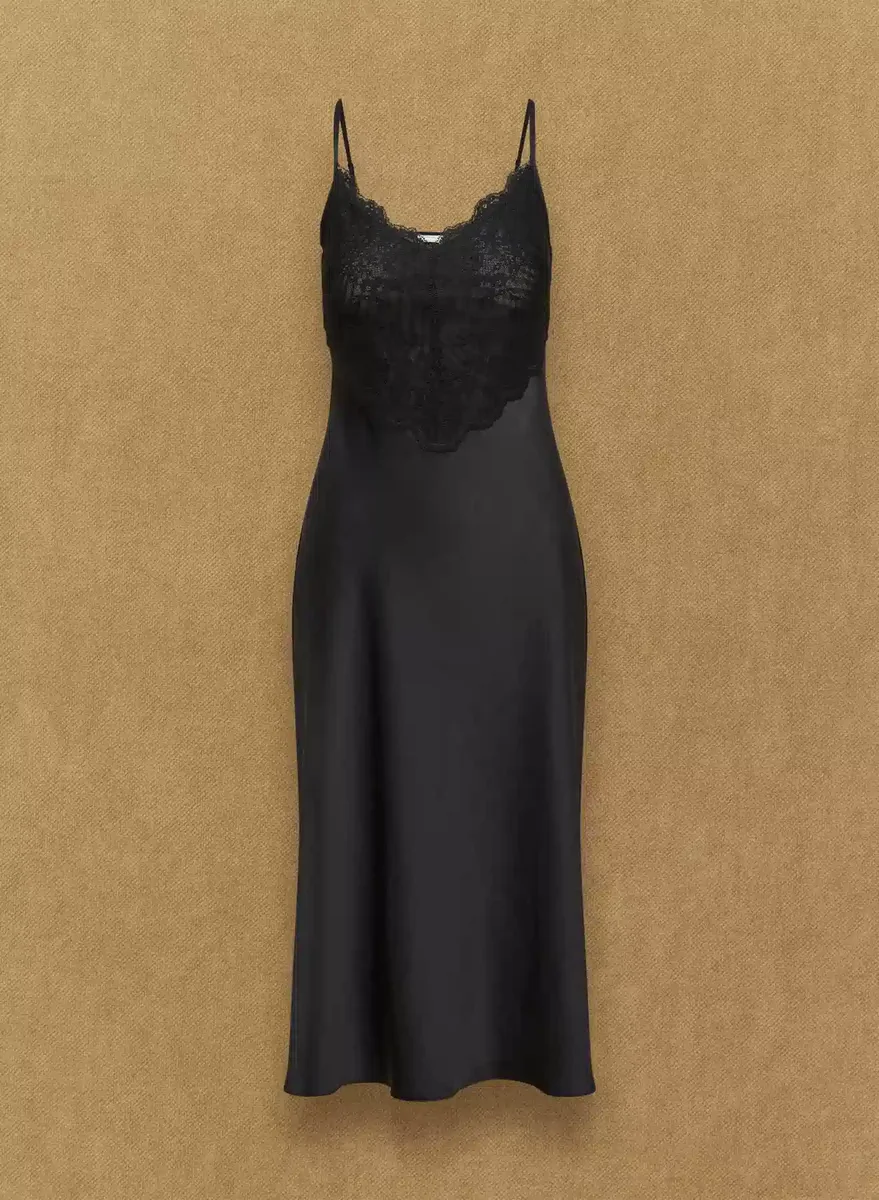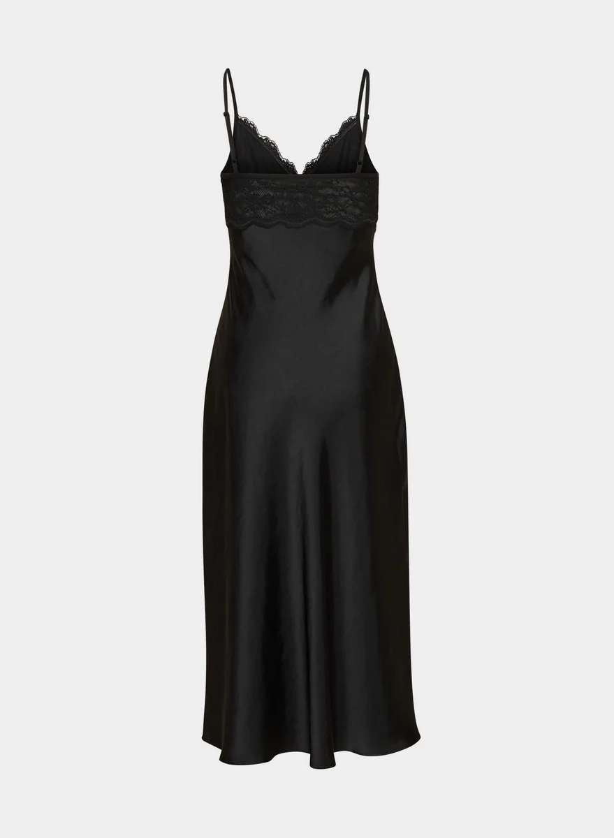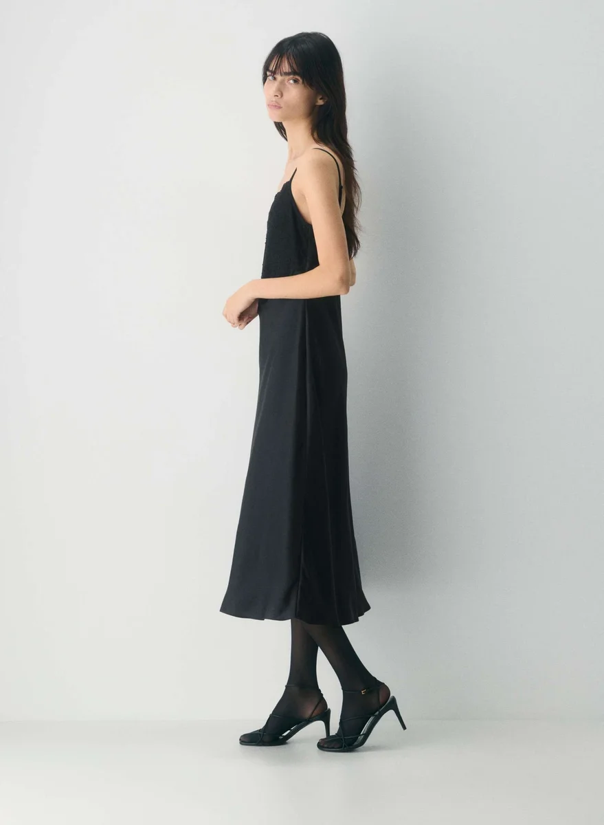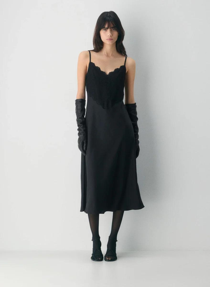 This is a V-neck slip dress with floral lace trim at the bodice. It’s cut from drapey Japanese satin with a soft sheen and vintage finish for a crinkled look and feel.