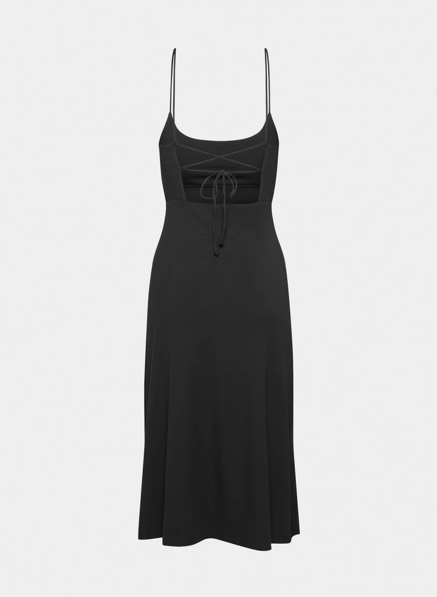 This is a strappy midi dress with a thigh slit. It’s made with GoodLux — luxuriously soft, drapey fabric made with LENZING™ ECOVERO™ Viscose.