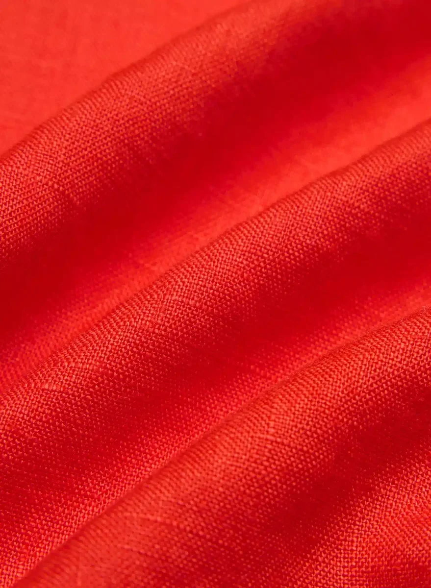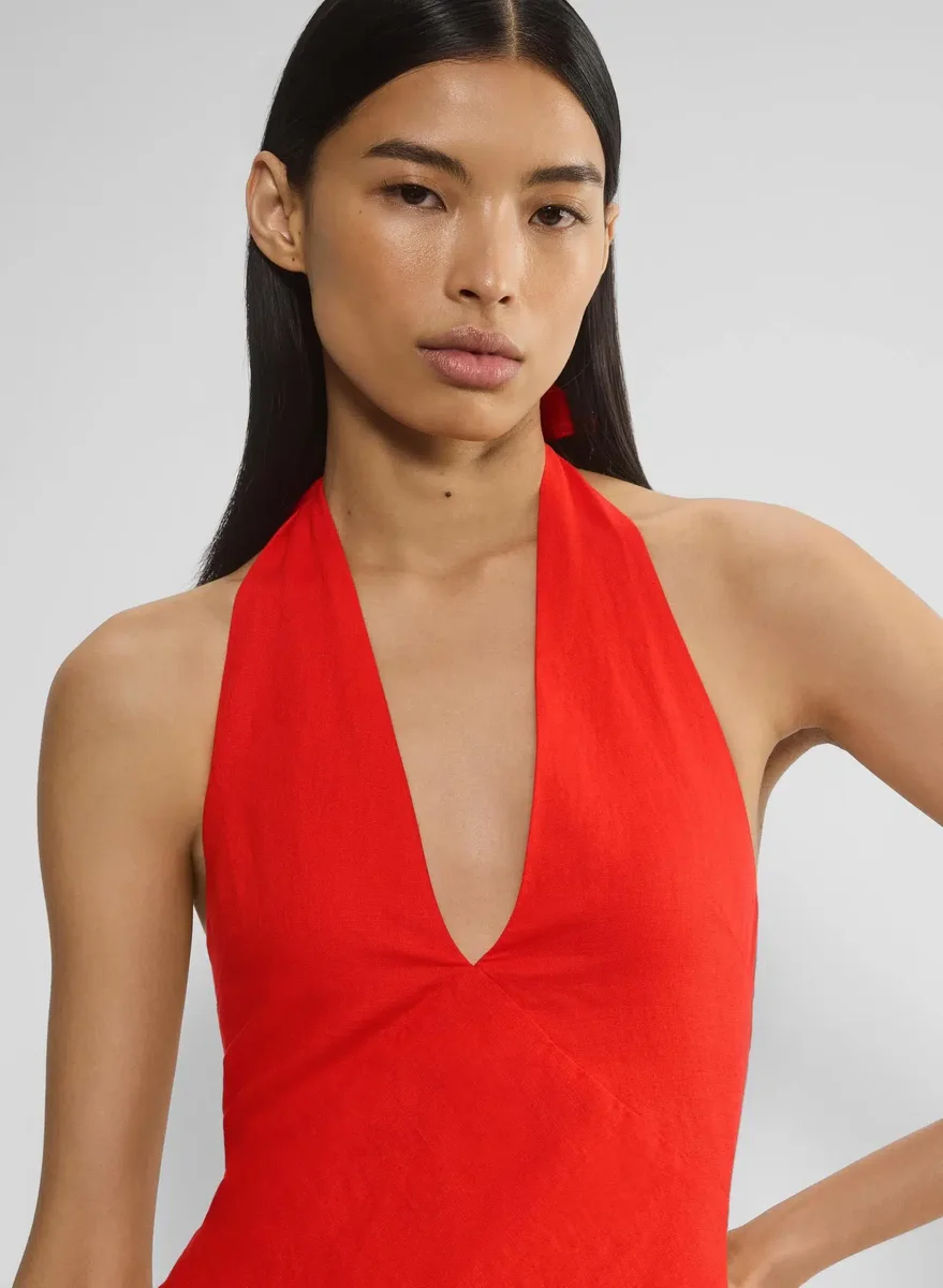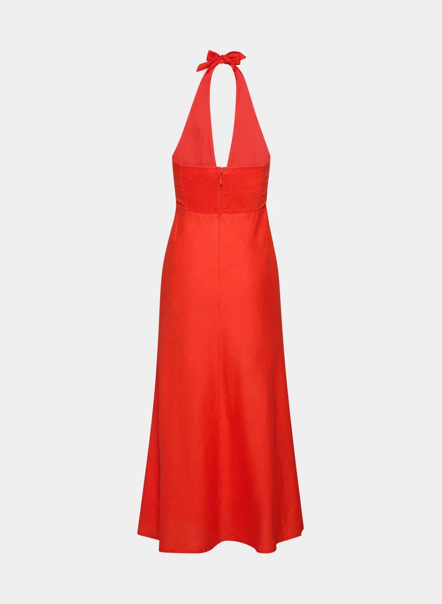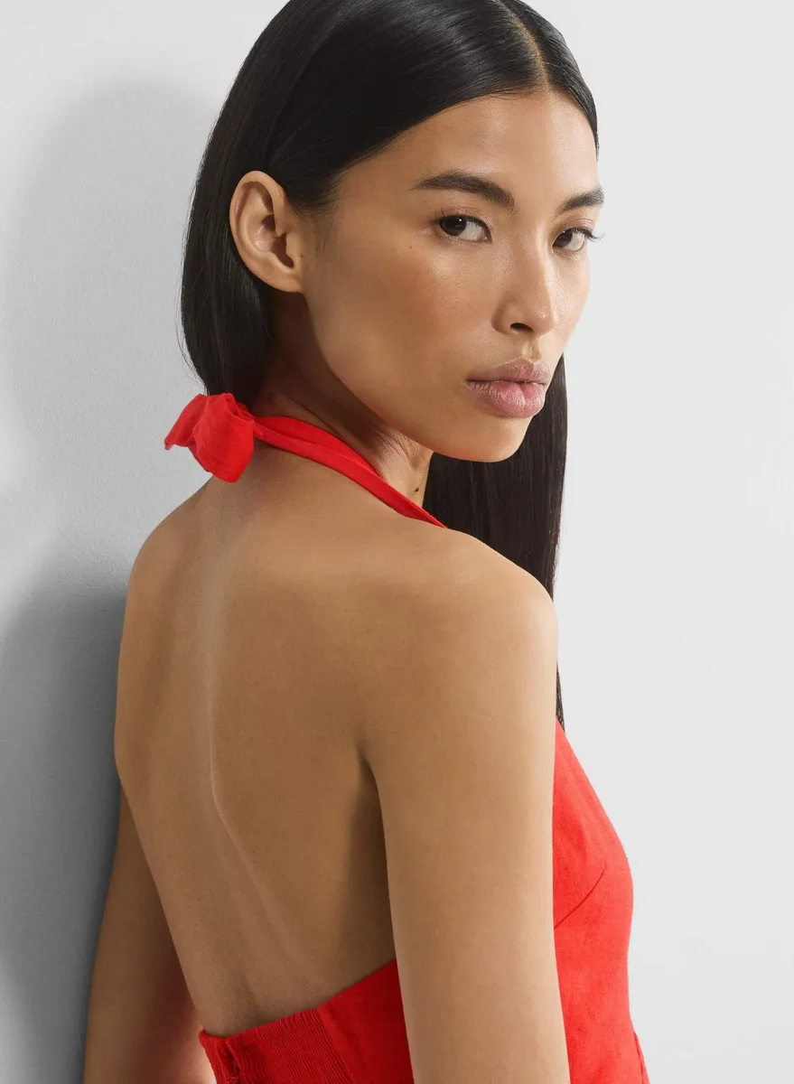 Probably abroad. This is a halter dress with adjustable straps and a smocked back. It’s made from breathable 100% organic linen with a natural texture and soft, airy feel.