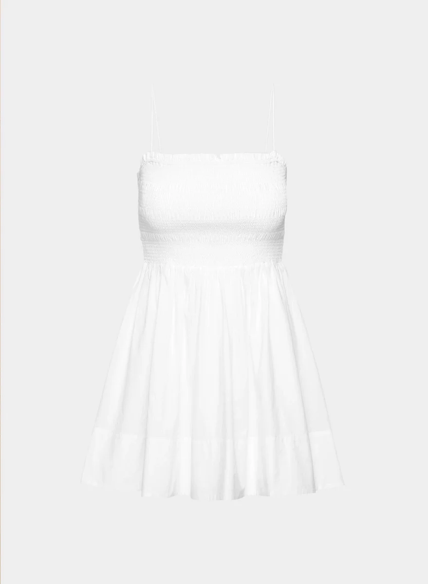 Great dress, great legsThis is a fit-and-flare dress with a open neckline and smocked bodice. It’s made from breathable 100% cotton poplin with a crisp, airy feel that’s smooth to the touch.