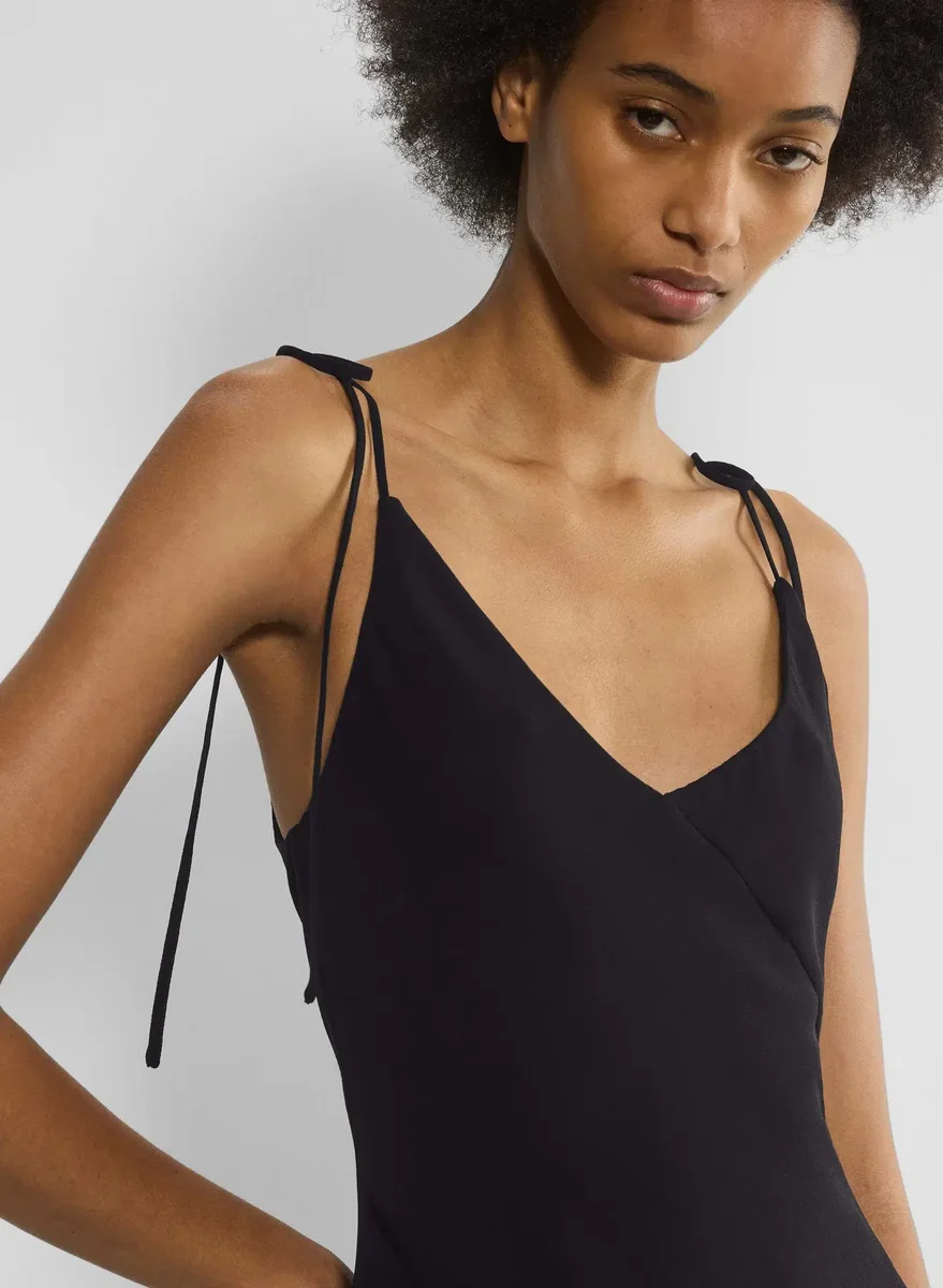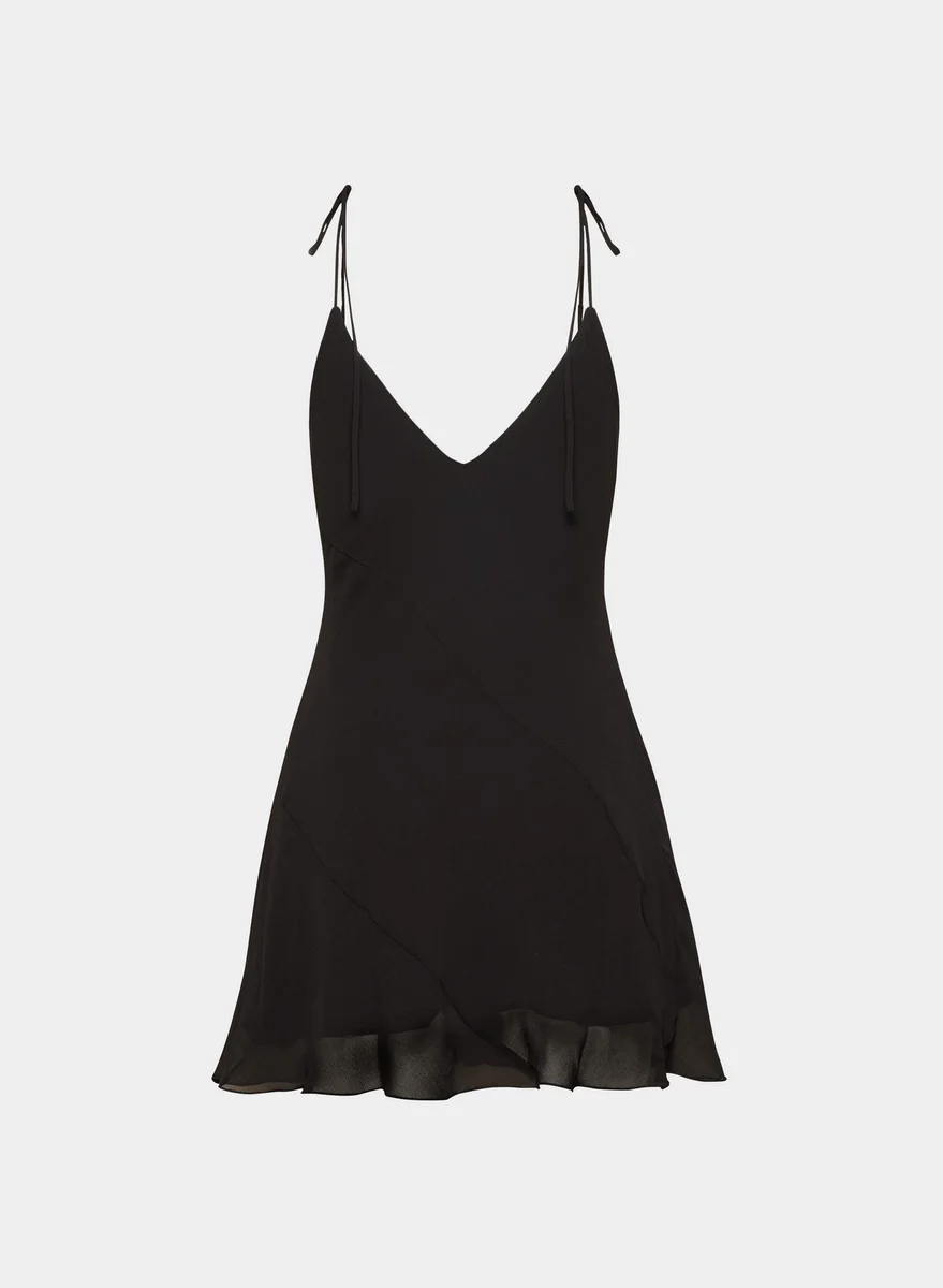 This is a V-neck slip mini dress. It’s cut from Fête Chiffon™ — lightweight, semi-sheer fabric with an ethereal drape. This version is made from 100% recycled polyester.