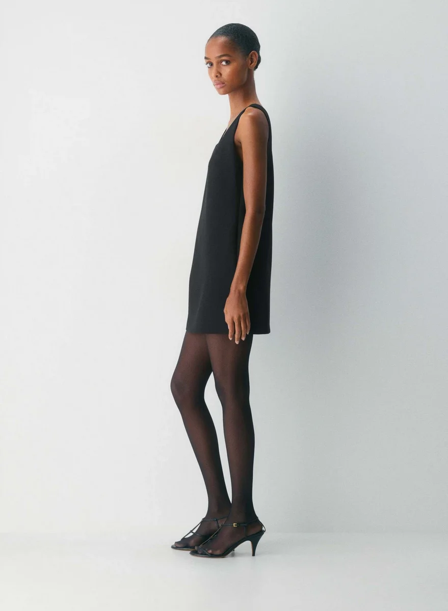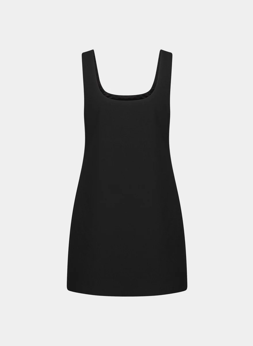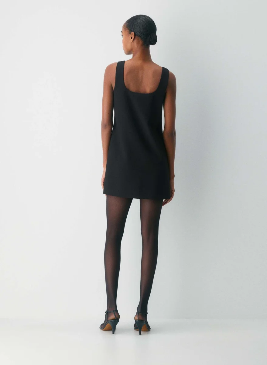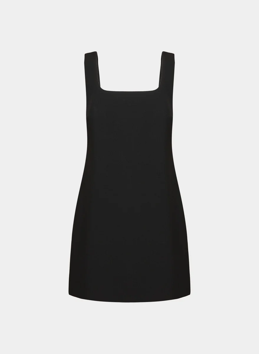 This is a lined squareneck shift dress with an invisible side zip. It’s cut from (Re)ssential — softly structured stretch fabric that holds its form while you move easy. This fabric is sourced from a premier Portuguese mill and made with 58% recycled polyester and 28% LENZING™ ECOVERO™ Viscose.