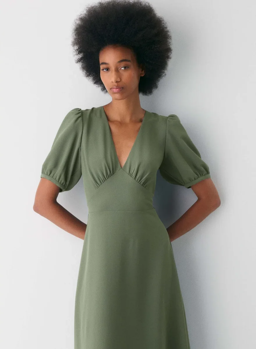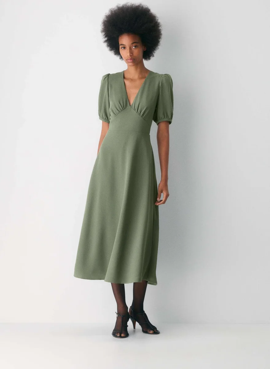 This is a V-neck maxi dress with a fit-and-flare silhouette. It’s tailored from (Re)twill™ — breezy, lightweight fabric with a beautifully soft drape. It’s made from 100% recycled polyester.