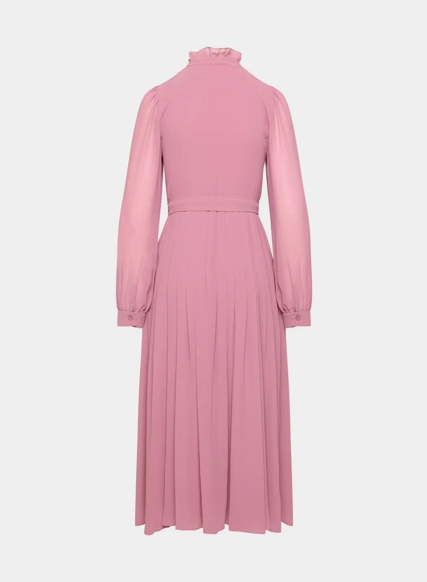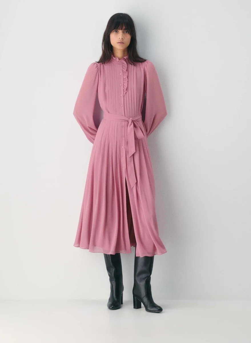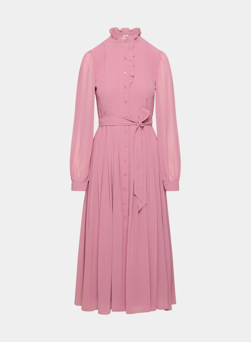 This is a lined button-up shirt dress with a ruffled collar and a self-tie belt. It’s made with Fête Chiffon™ — lightweight, semi-sheer fabric with an ethereal drape. This version is made from 100% recycled polyester.