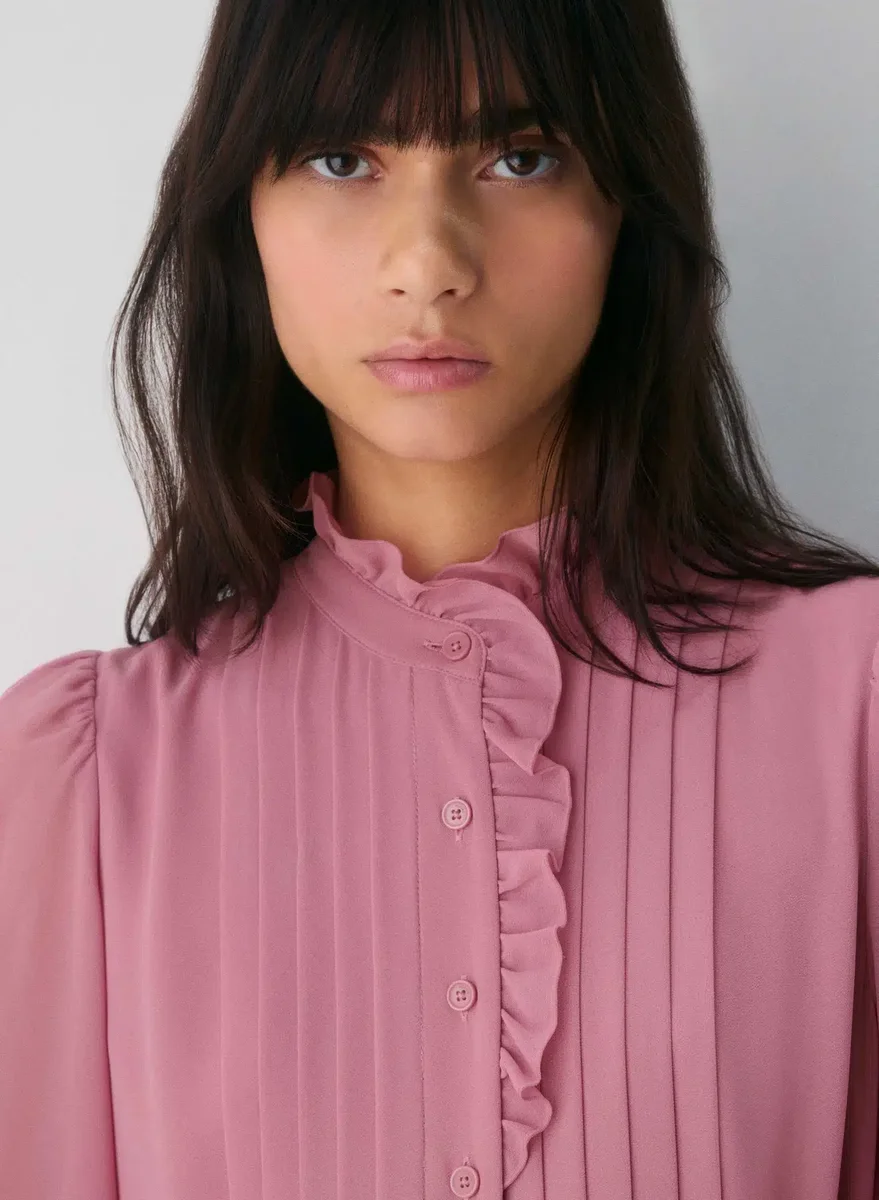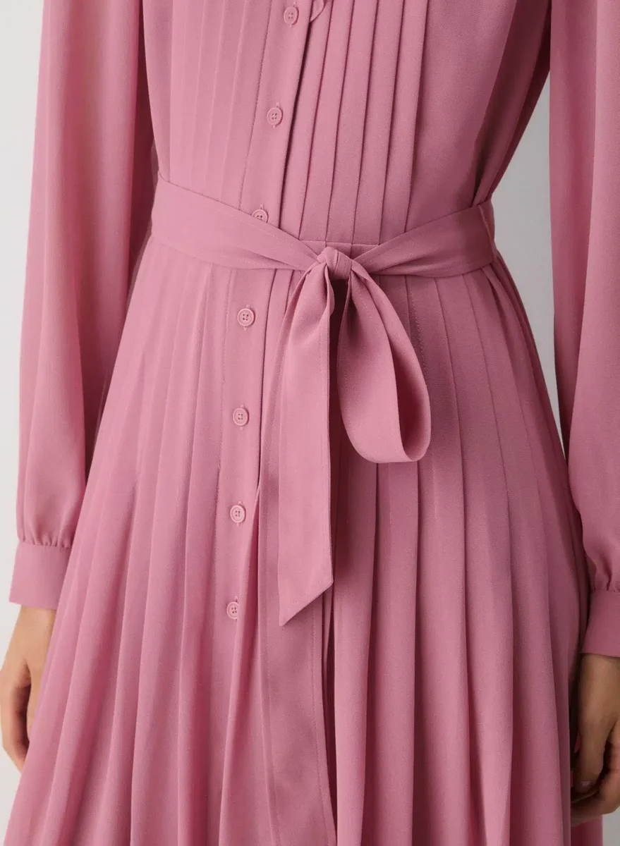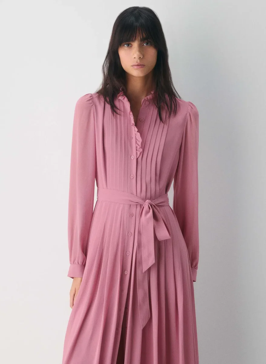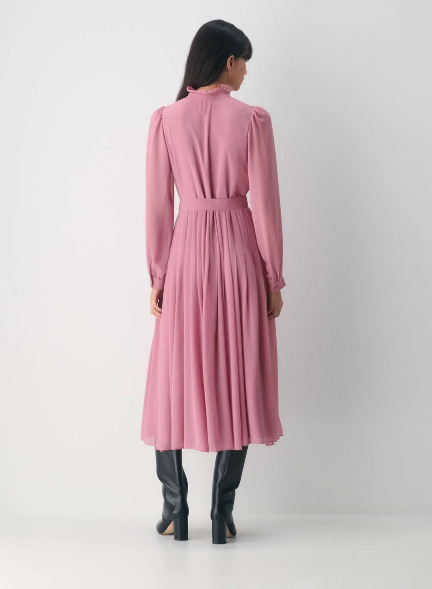 This is a lined button-up shirt dress with a ruffled collar and a self-tie belt. It’s made with Fête Chiffon™ — lightweight, semi-sheer fabric with an ethereal drape. This version is made from 100% recycled polyester.