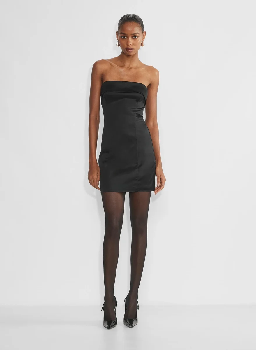 Your lip gloss is jealousThis is a lined strapless mini dress with princess seams for shaping. It’s cut from sleek satin with a soft sheen and smooth feel.