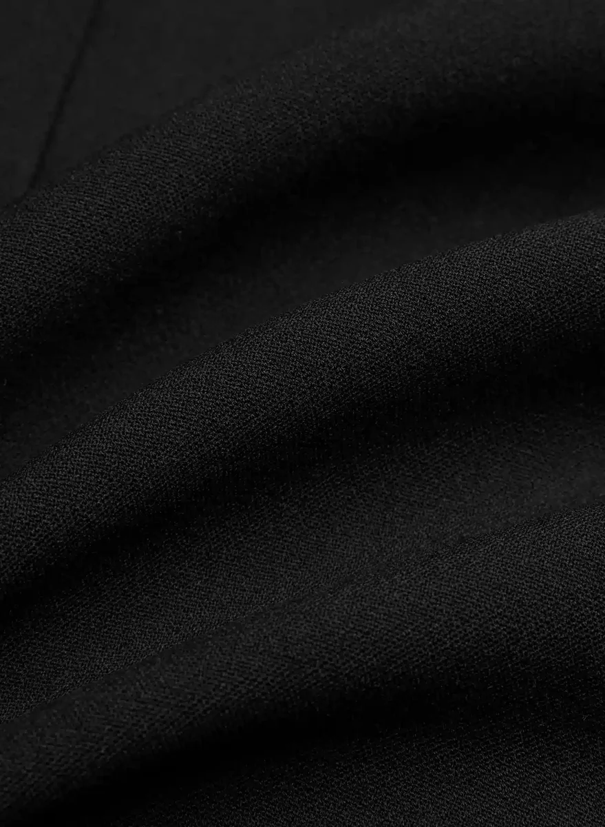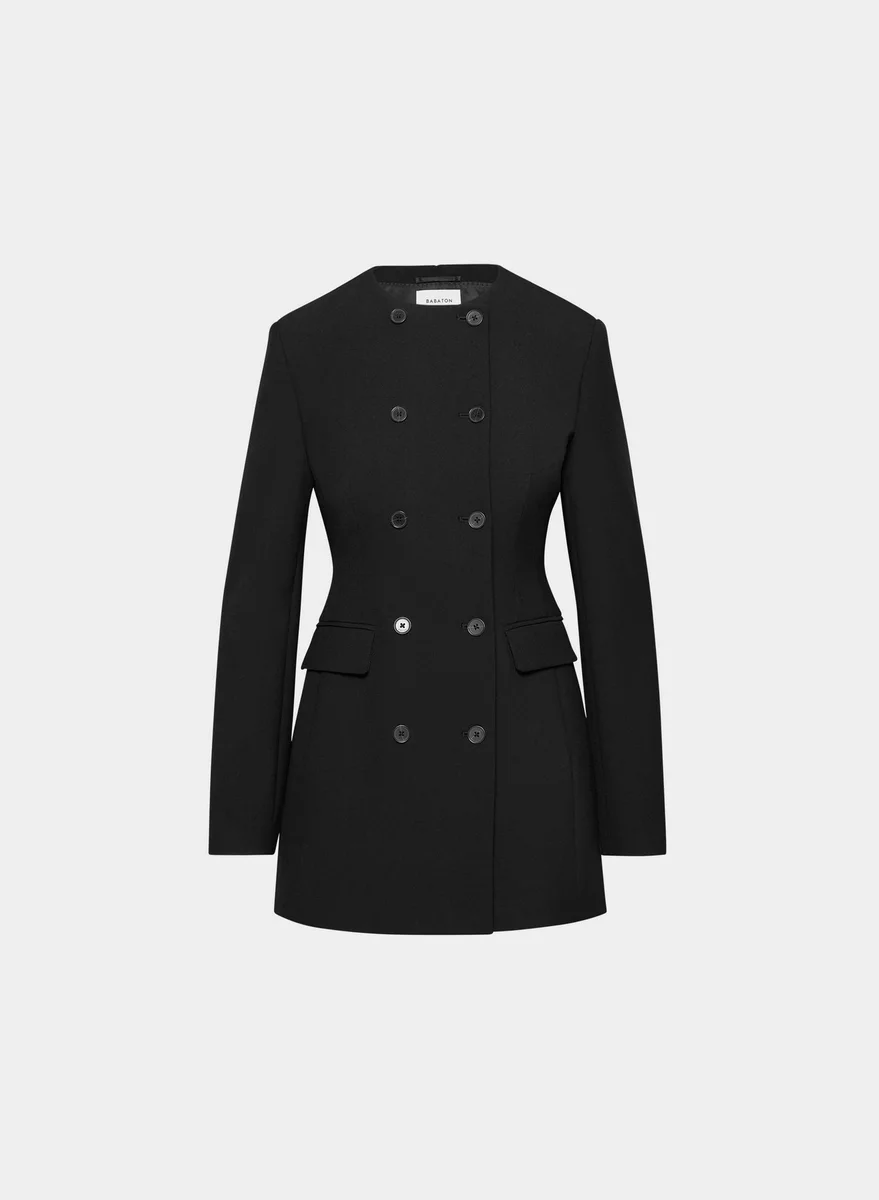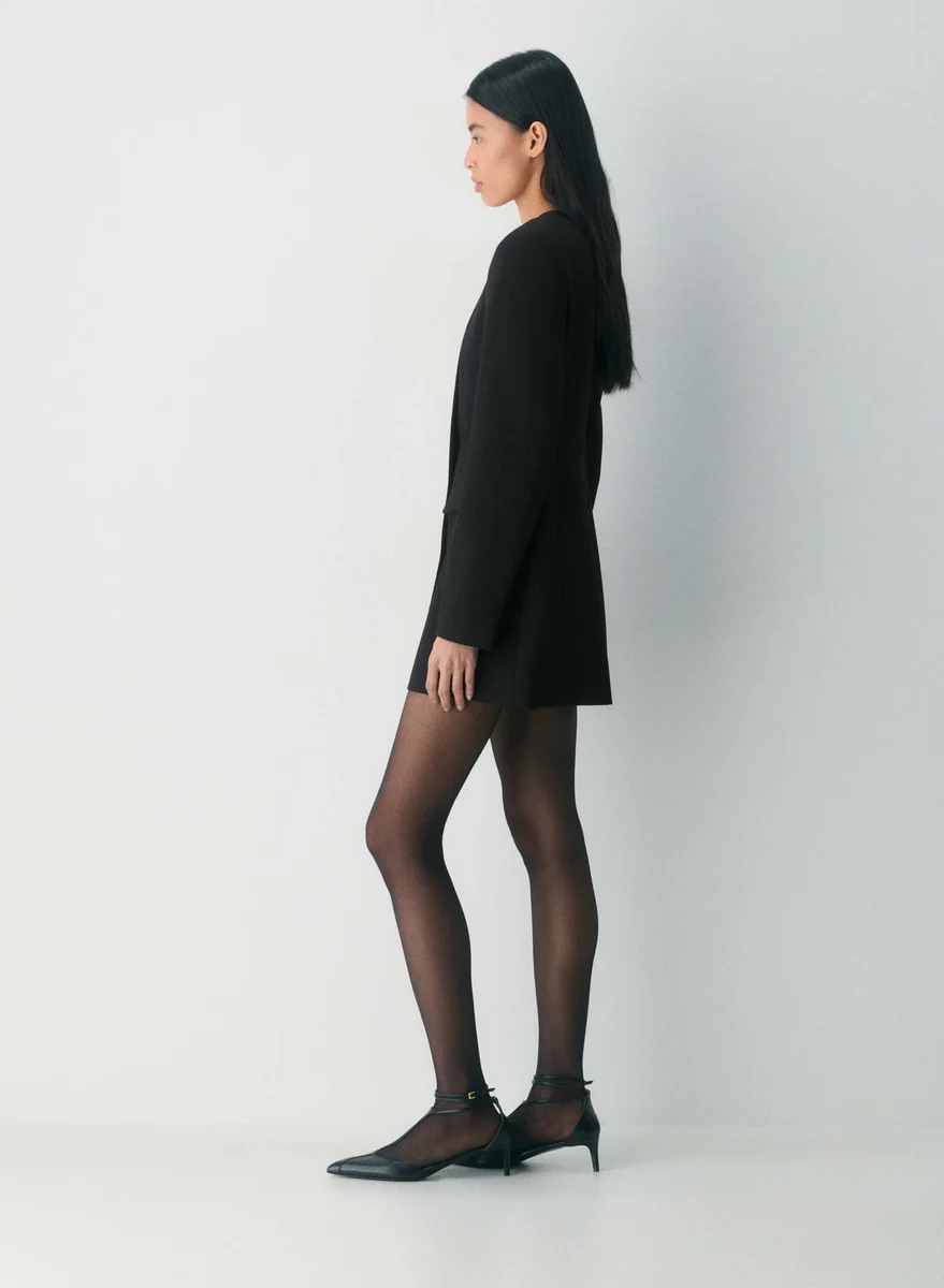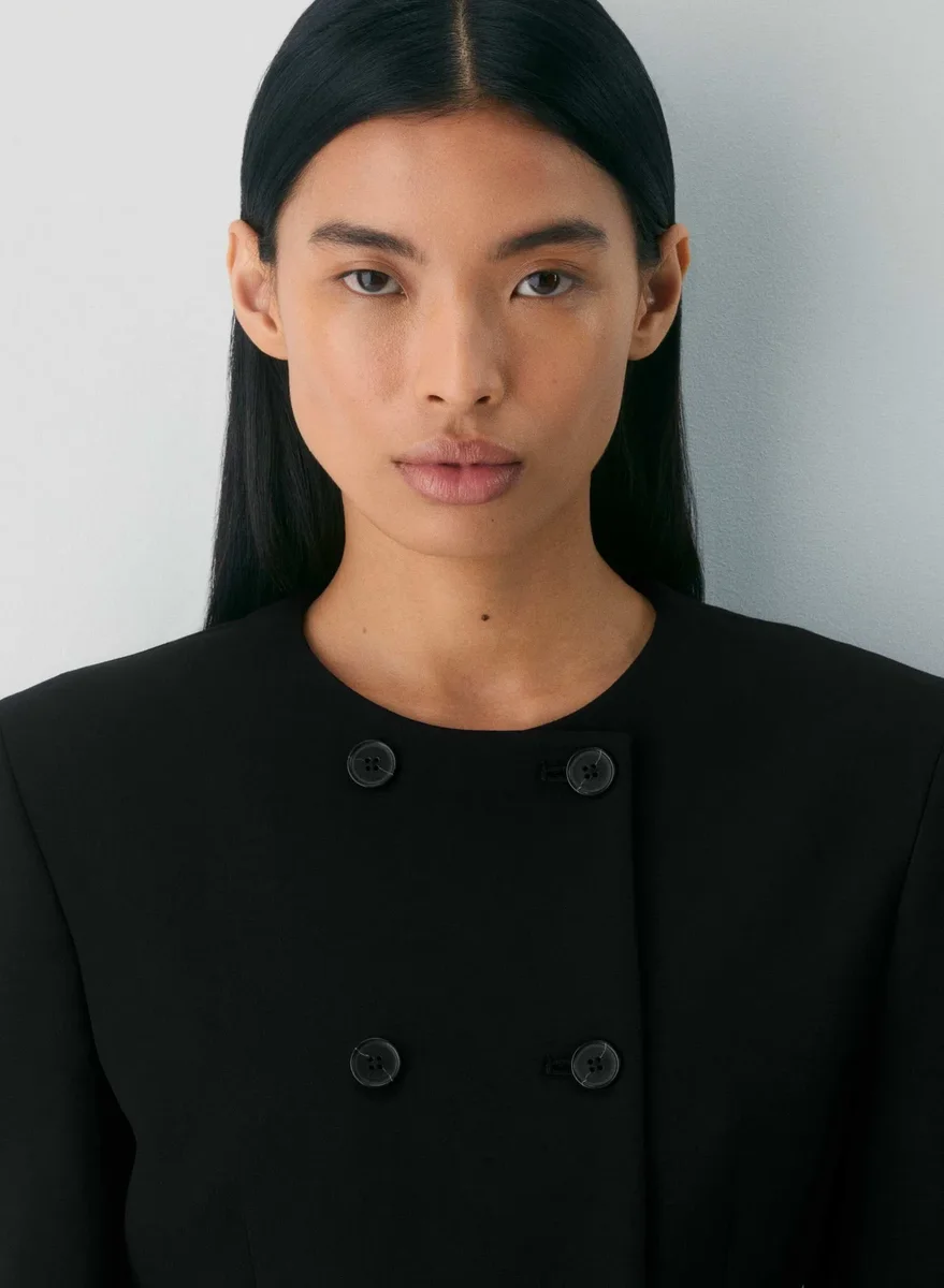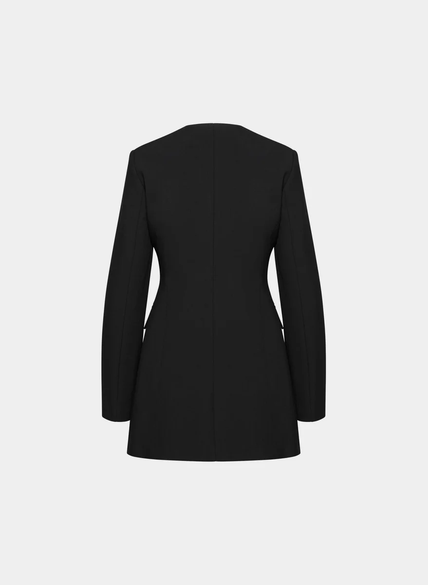 This is a double-breasted blazer dress with a notched lapel and an hourglass silhouette. It’s finely tailored with (Re)ssential — softly structured stretch fabric that holds its form while you move easy. This fabric is sourced from a premier Portuguese mill and made with 54% recycled polyester and 26% LENZING™ ECOVERO™ Viscose.