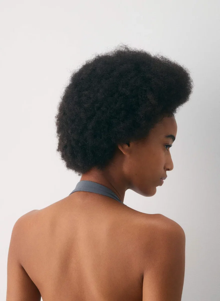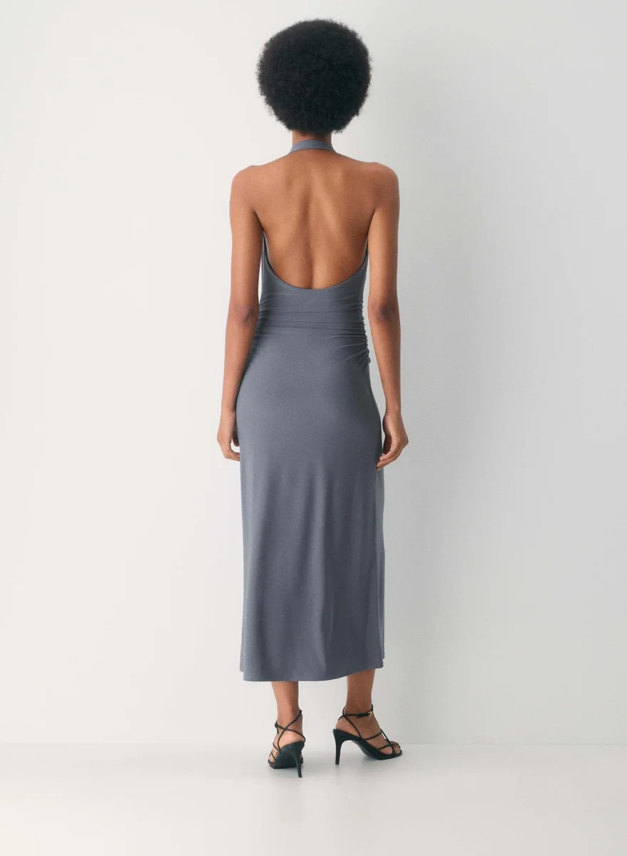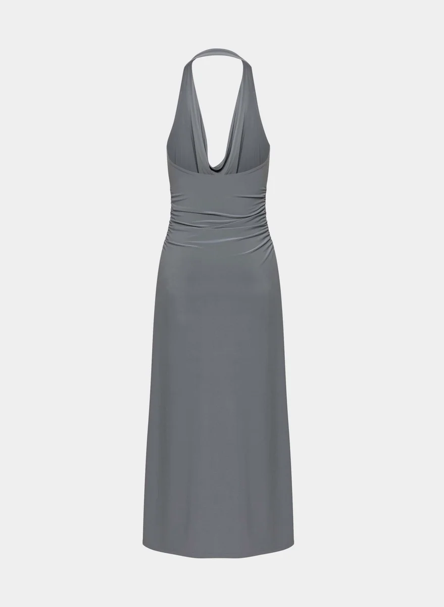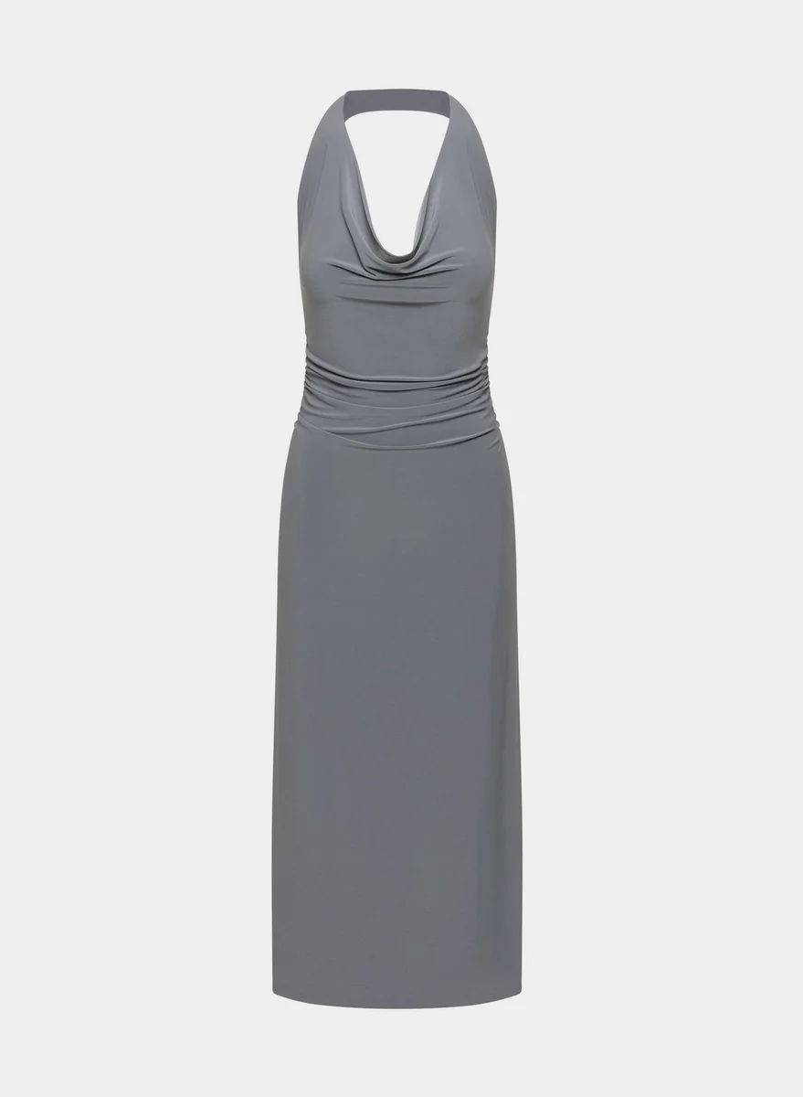 Just doing girlish thingsThis is a halter neck maxi dress with rouched sides and a slim fit. It’s made with stretch jersey that feels cool and smooth to the touch. Drapes beautifully.