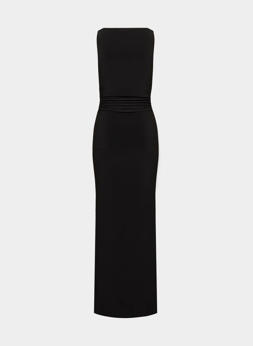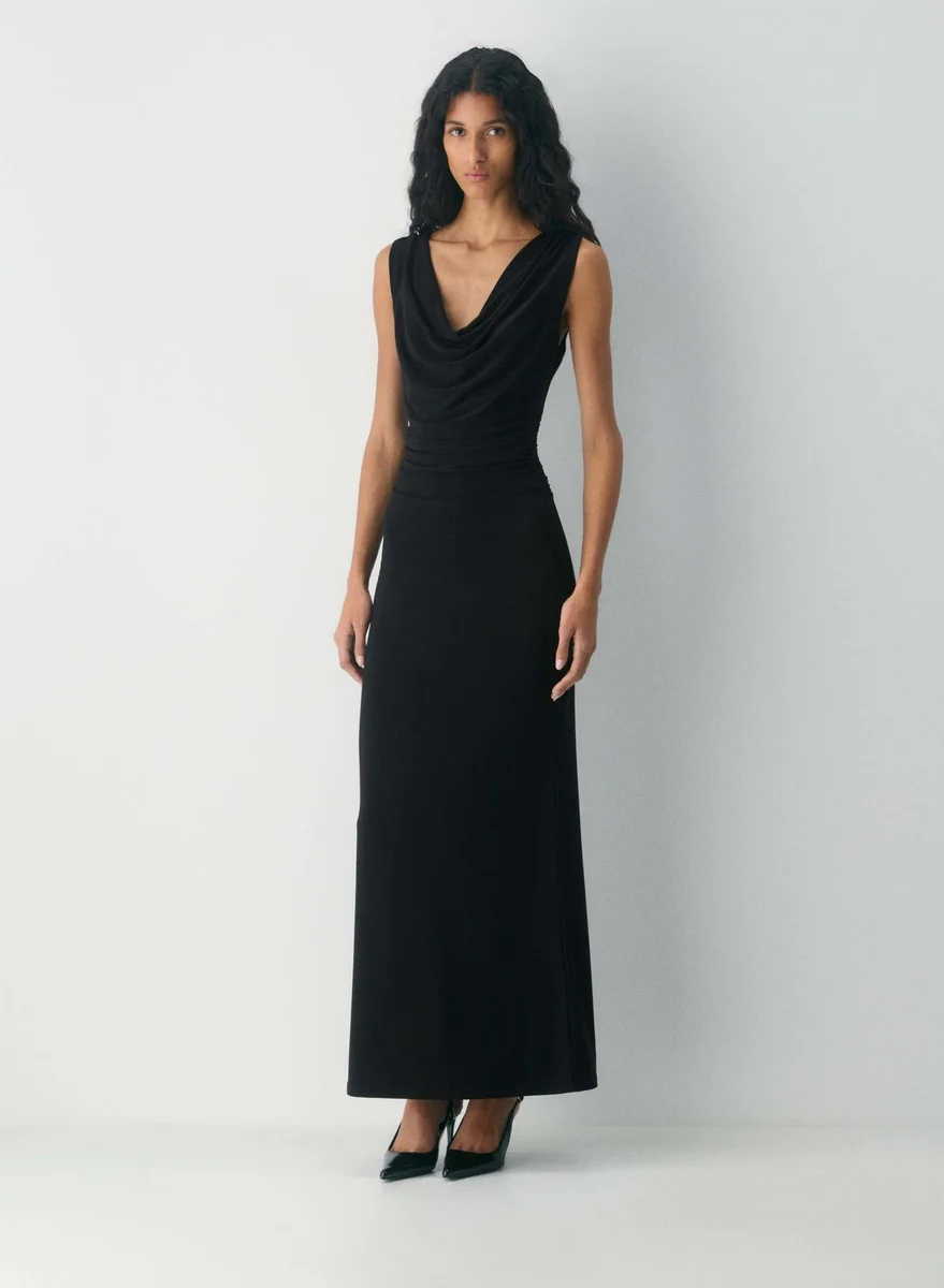 This is a cowlneck maxi dress with a tight fit. It’s made with Smooth Matter™ — drapey stretch jersey with a luxe, sleek feel and soft sheen.