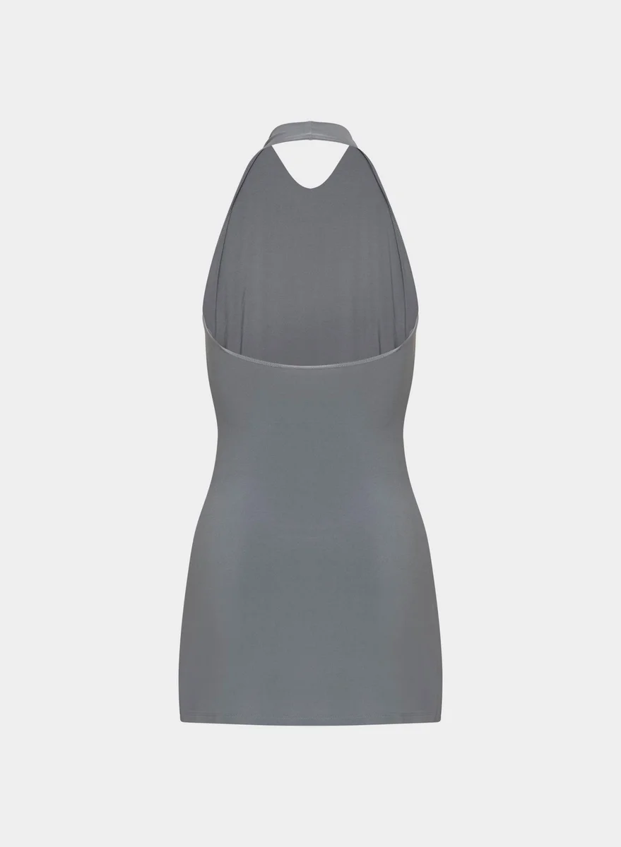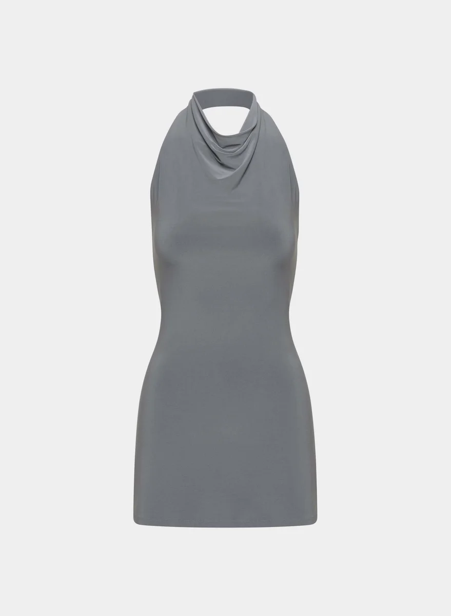 For balance. This is a halterneck mini dress with a cowl neckline. It’s made with stretch jersey that feels cool and smooth to the touch. Drapes beautifully.