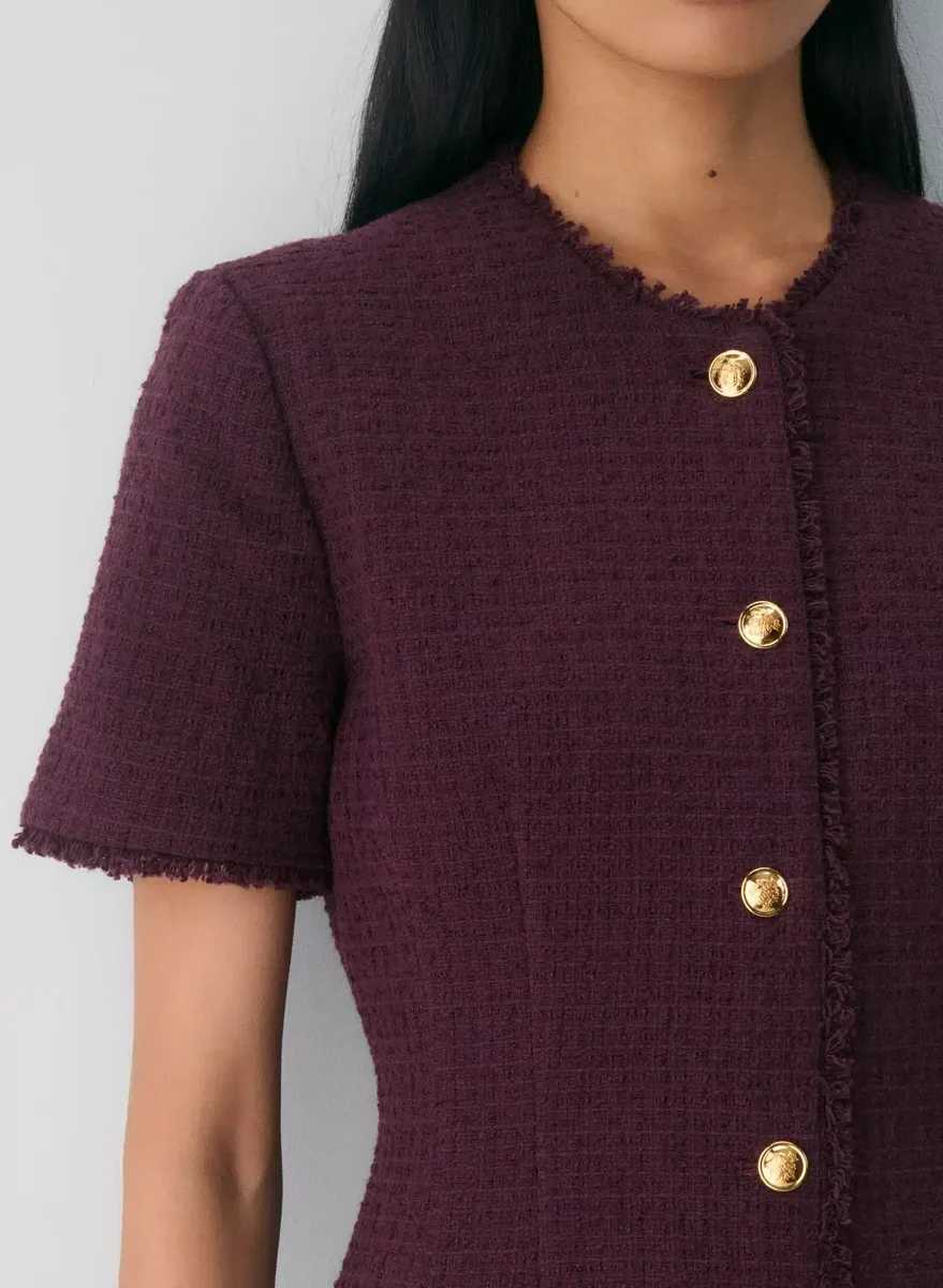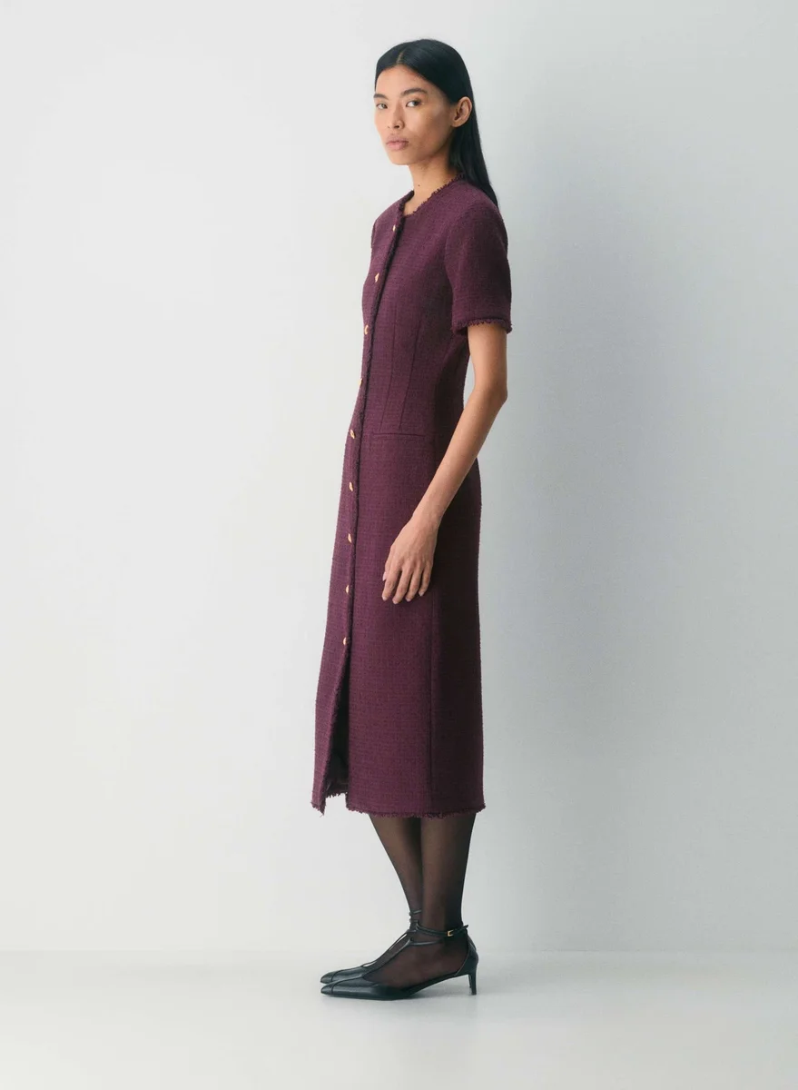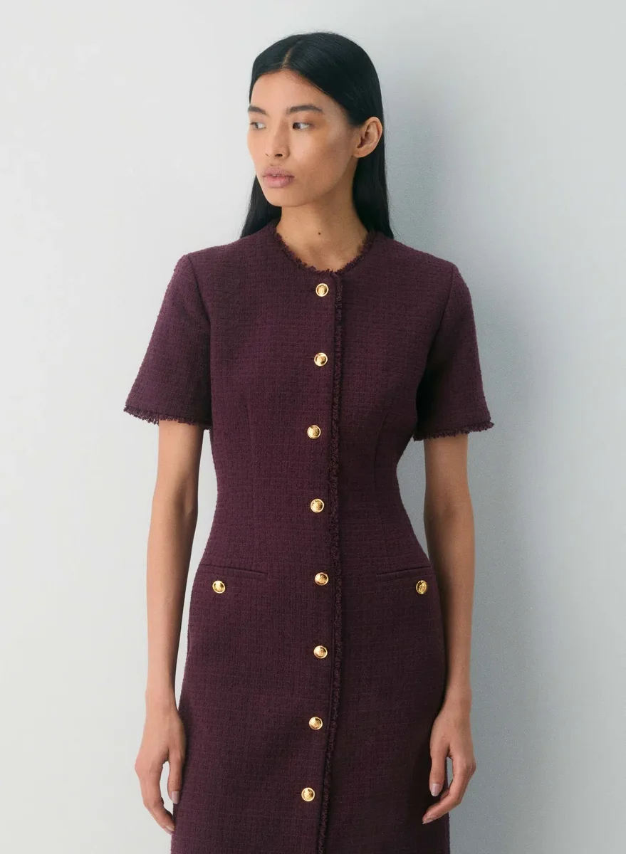 Button upThis is a shortsleeve dress with a button closure, darted waist and welt pockets. It’s finely tailored with softly structured tweed with a textured feel. This fabric is made with 35% recycled polyester.