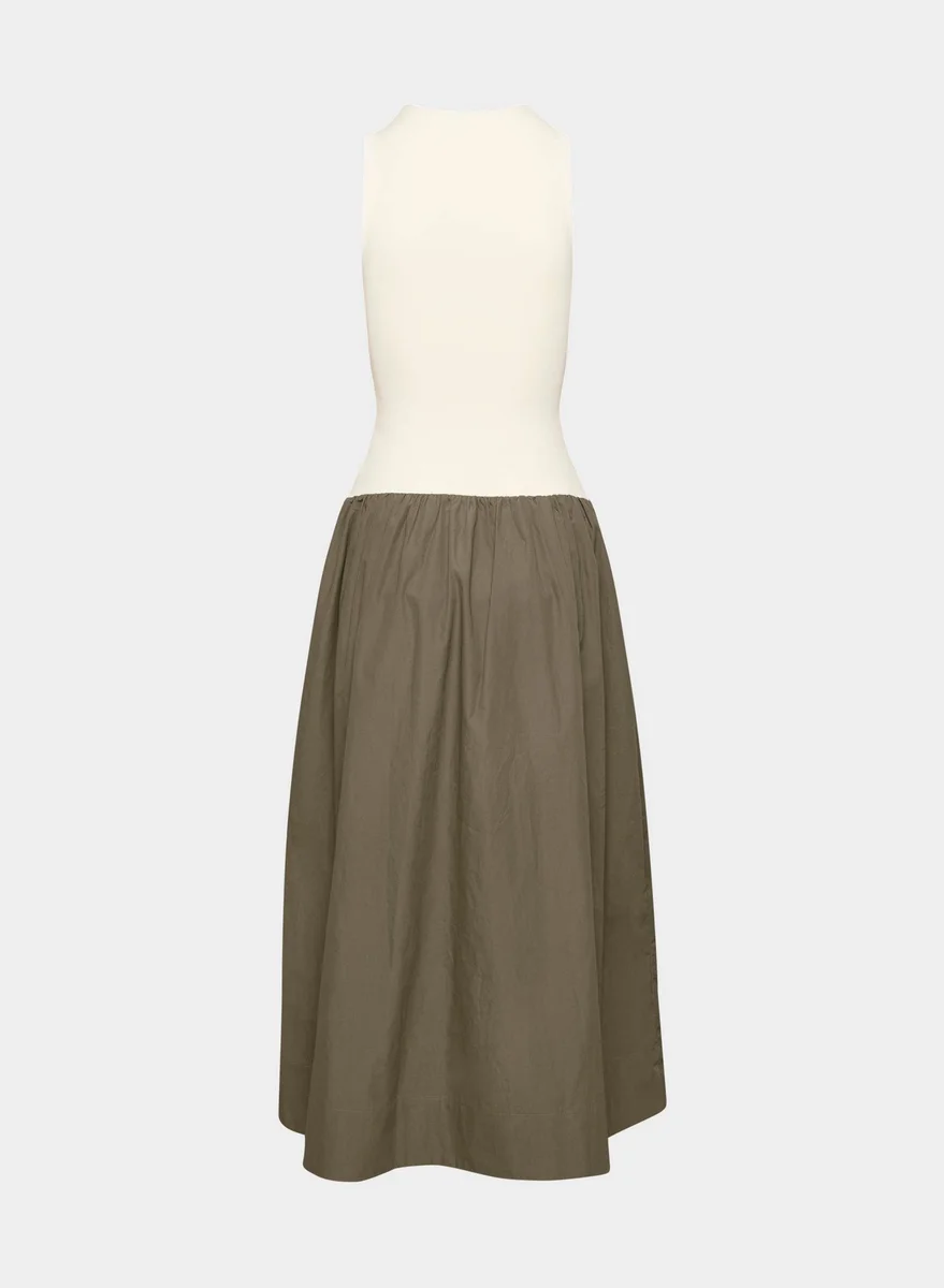 This is a crewneck fit-and-flare maxi dress with a drop waist. The bodice is cut from Aritzia’s Original Contour — luxe, ultra-flattering fabric coveted for its smoothing effect and second-skin feel. Nothing more essential. The skirt is made from breathable cotton poplin with a crisp, airy feel that’s smooth to the touch.