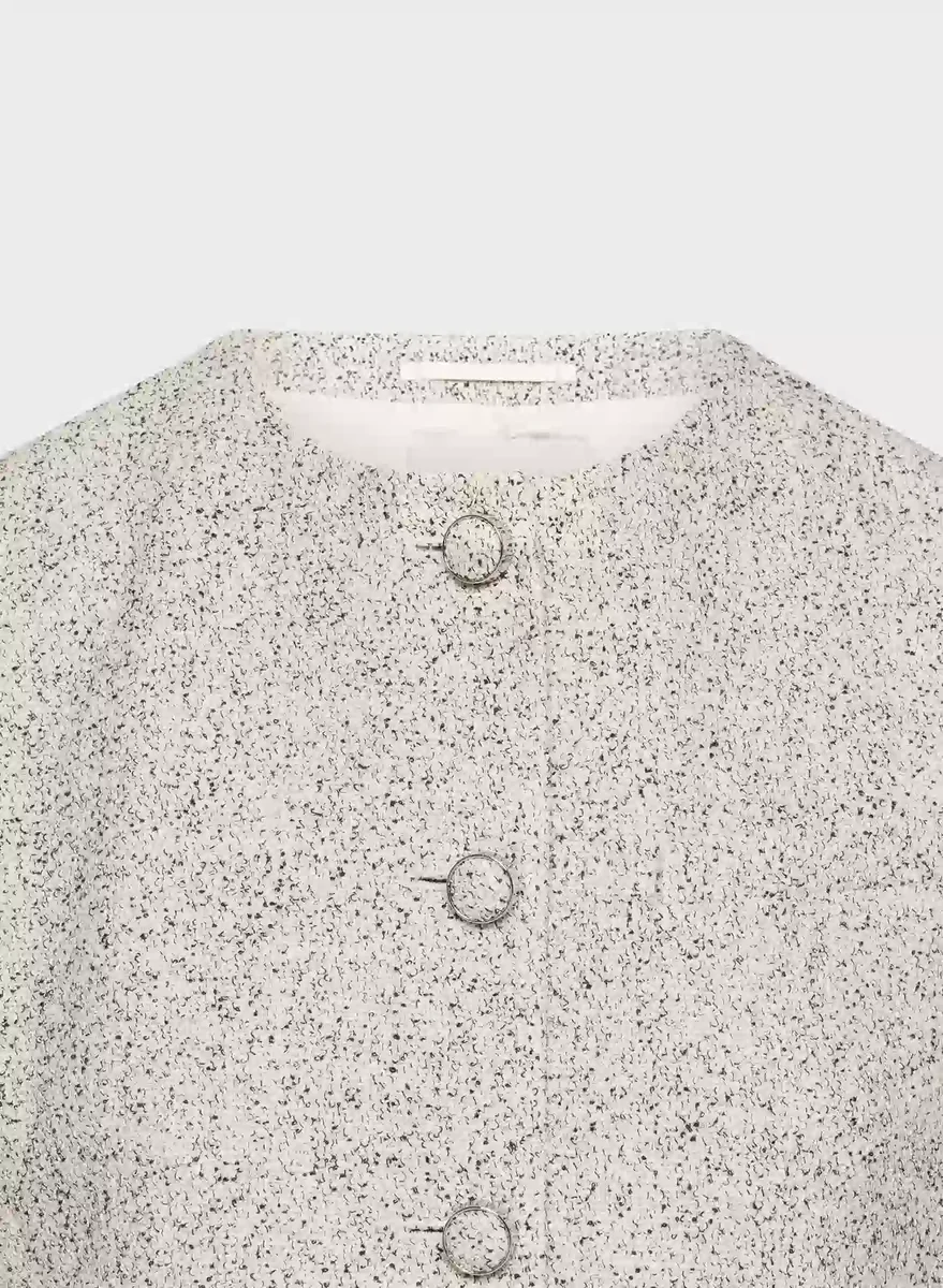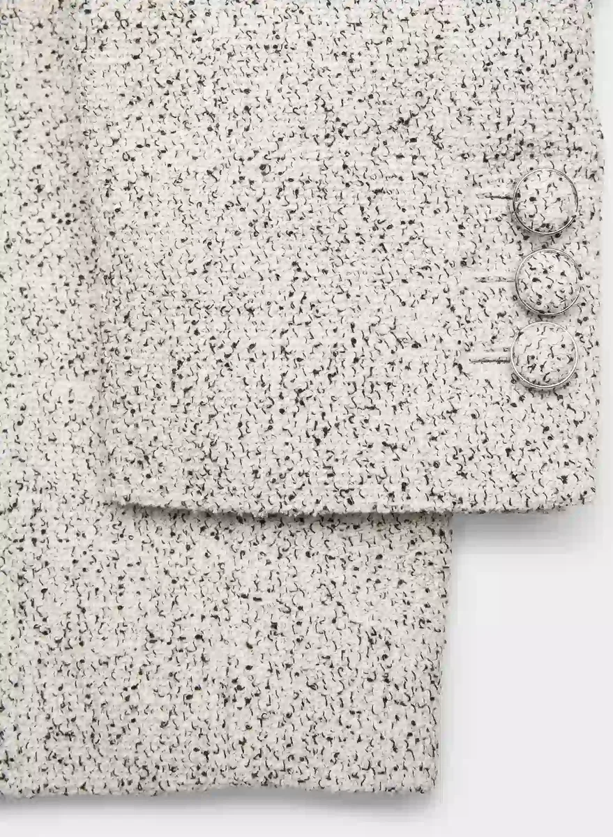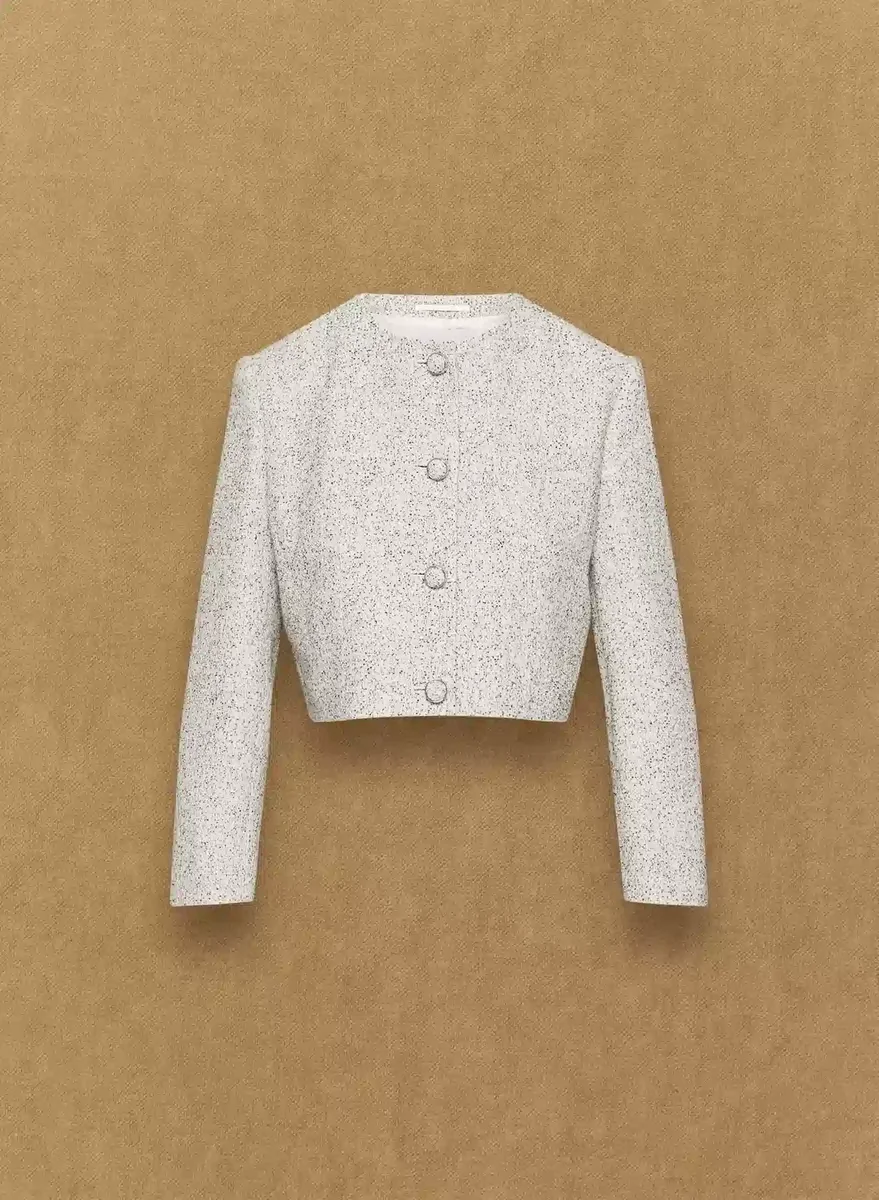 This is a button-up jacket with shoulder pads and a classic fit. It’s expertly tailored using softly structured tweed with a textured feel. This fabric is made with 45% recycled polyester.