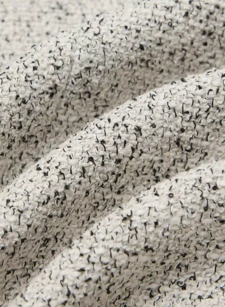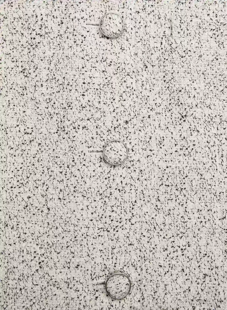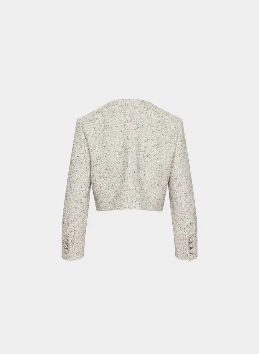 This is a button-up jacket with shoulder pads and a classic fit. It’s expertly tailored using softly structured tweed with a textured feel. This fabric is made with 45% recycled polyester.