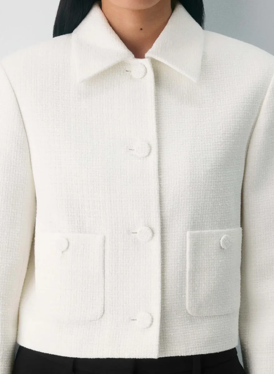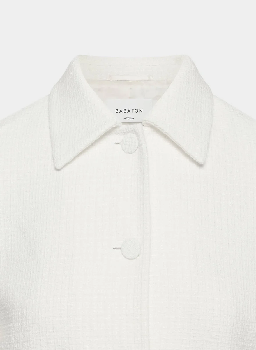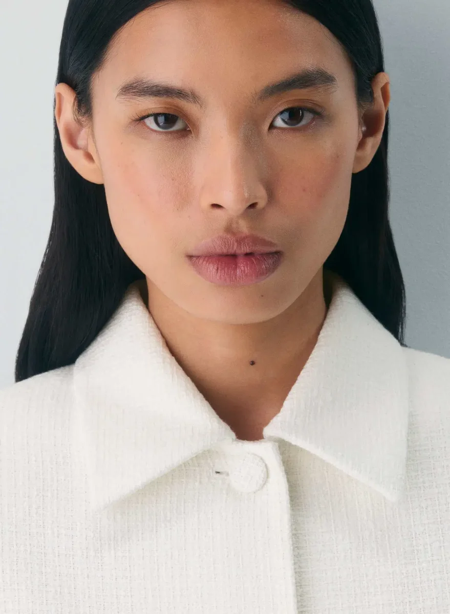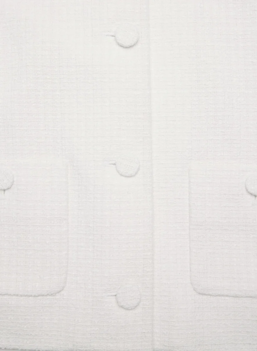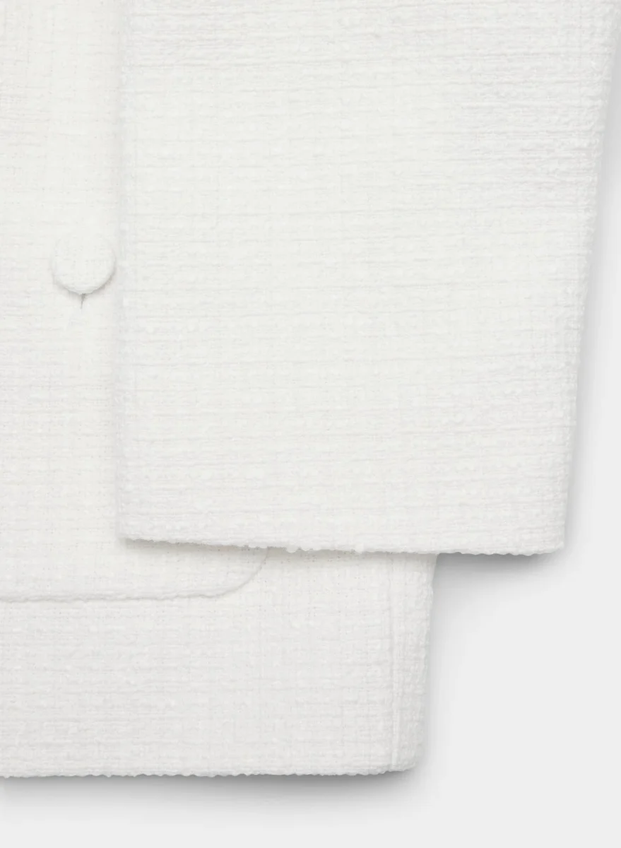 Call this your promotion jacketThis is a fully lined button-up jacket with patch pockets and shoulder pads. It’s expertly tailored with softly structured tweed with a textured feel. This fabric is made with 35% recycled polyester.